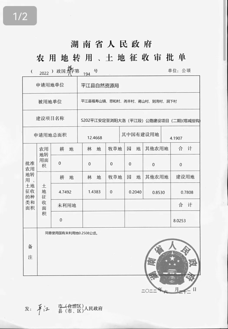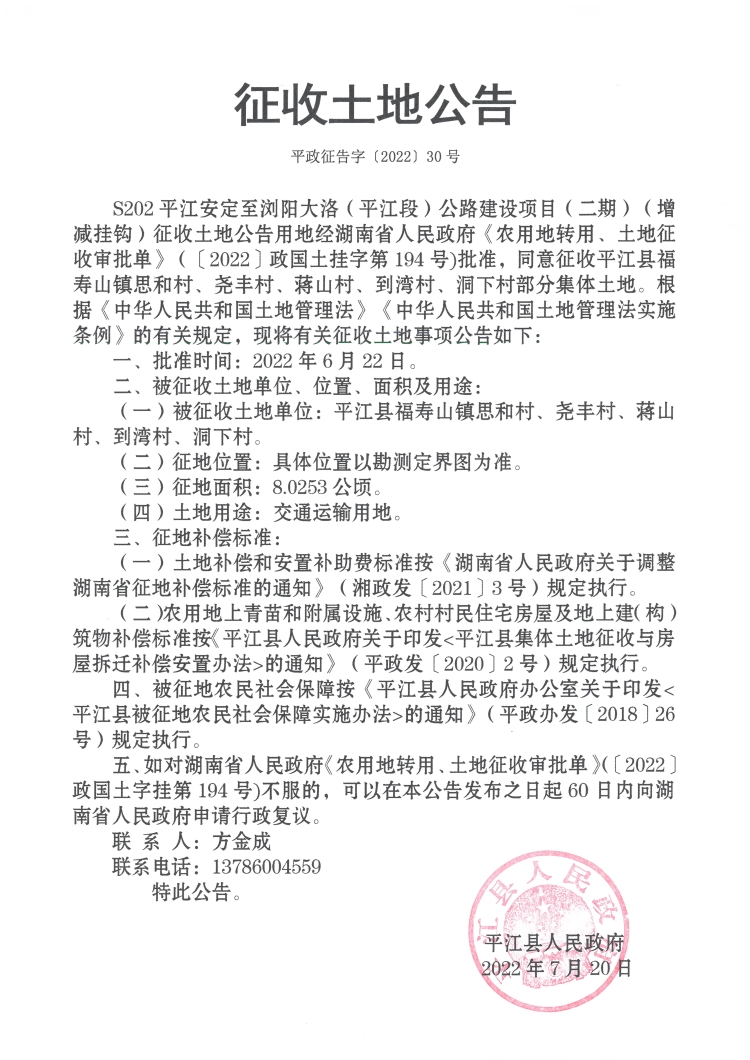 S202平江安定至浏阳大洛(平江段)公路建设项目(二期)(增减挂钩)征收土地公告