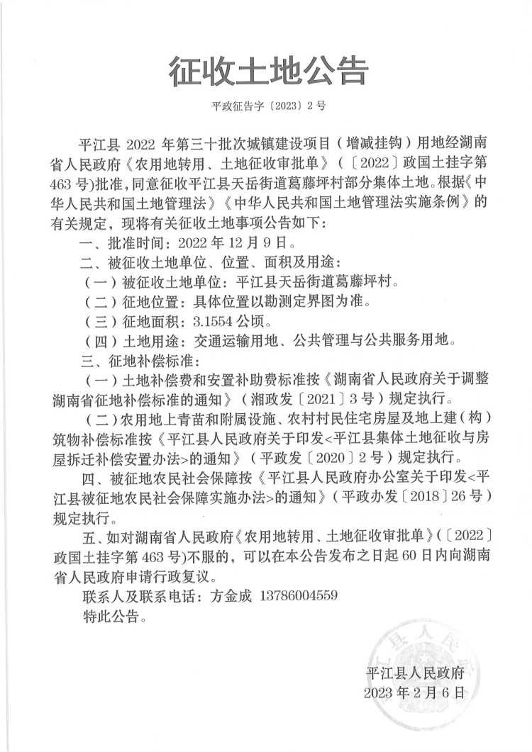 平江县2022年第三十批次城镇建设项目征收土地公告