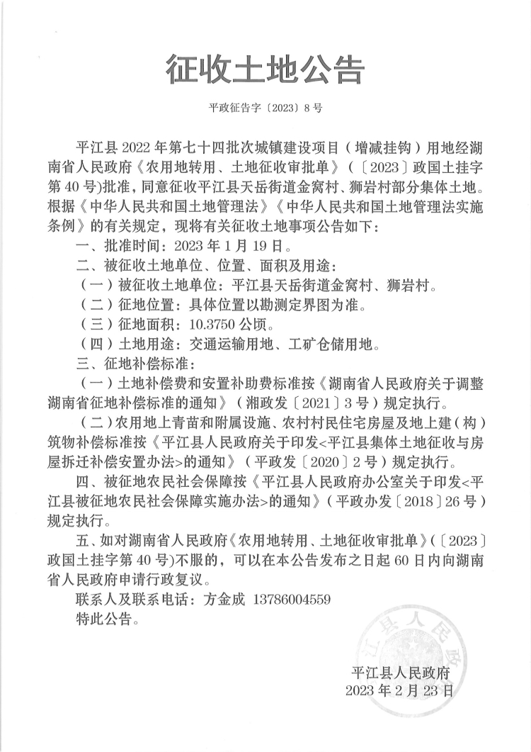 平江县2022年第七十四批次城镇建设项目征收土地公告
