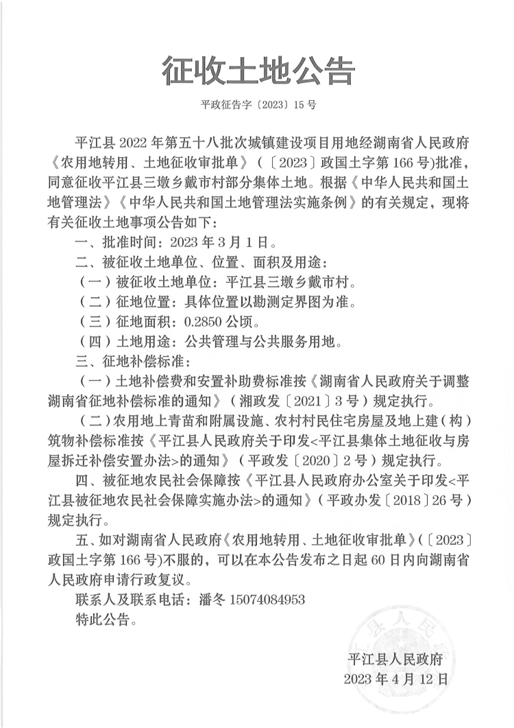 平江县2022年第五十八批次城镇建设项目征收土地公告