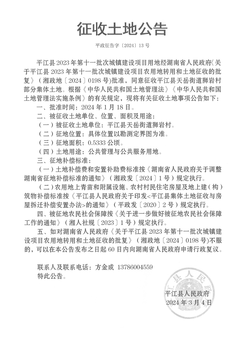 平江县2023年第十一批次城镇建设项目征收土地公告