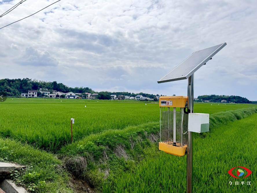 伍市镇是粮食生产大镇,素有“平江粮仓”之称。在伍市镇四知村1300亩水稻示范区,一块块稻田整齐布局,连片的早稻长势喜人,一个个白色“小灯笼”似的诱捕器、干扰器、一盏盏太阳能杀虫灯点缀其间,农户们正穿梭在田地里查看水稻长势和病虫害情况。