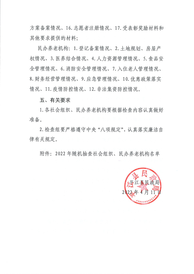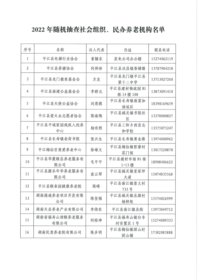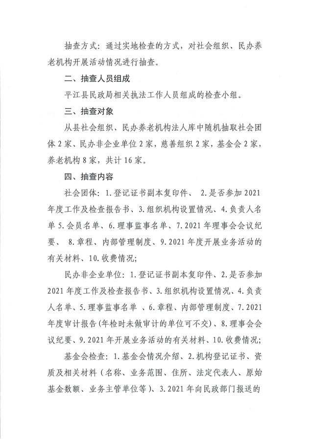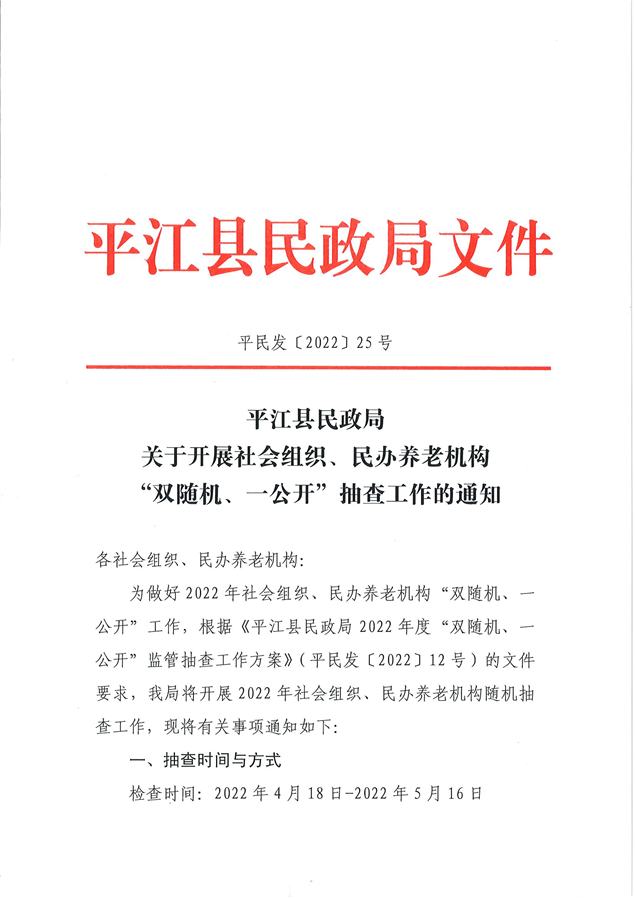 平江县民政局关于开展社会组织、民办养老机构双随机、一公开抽查工作的通知