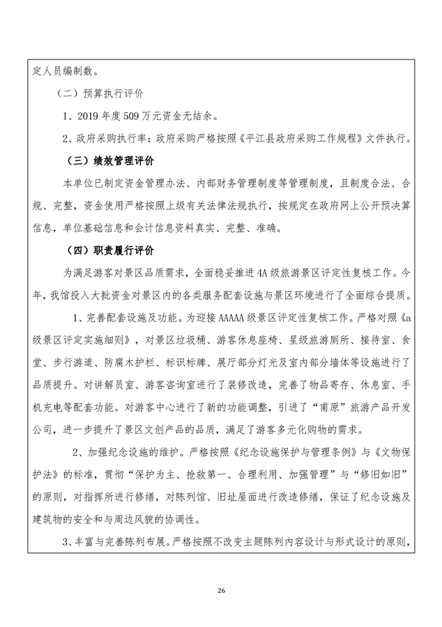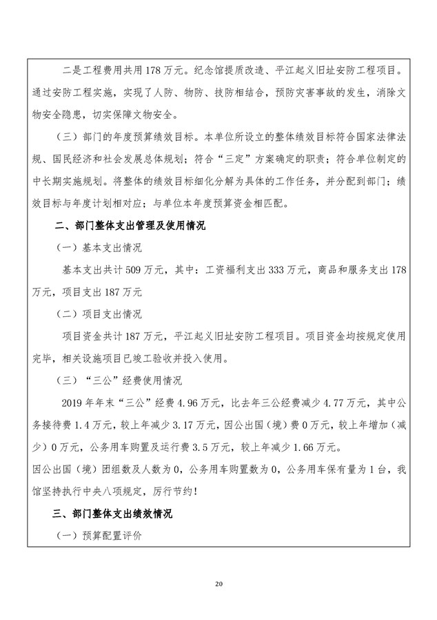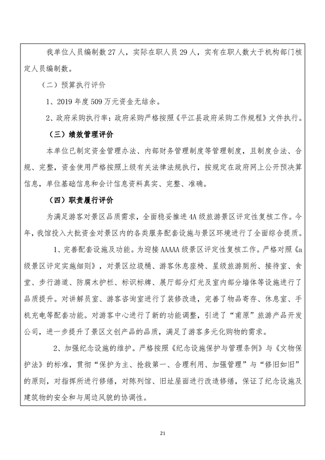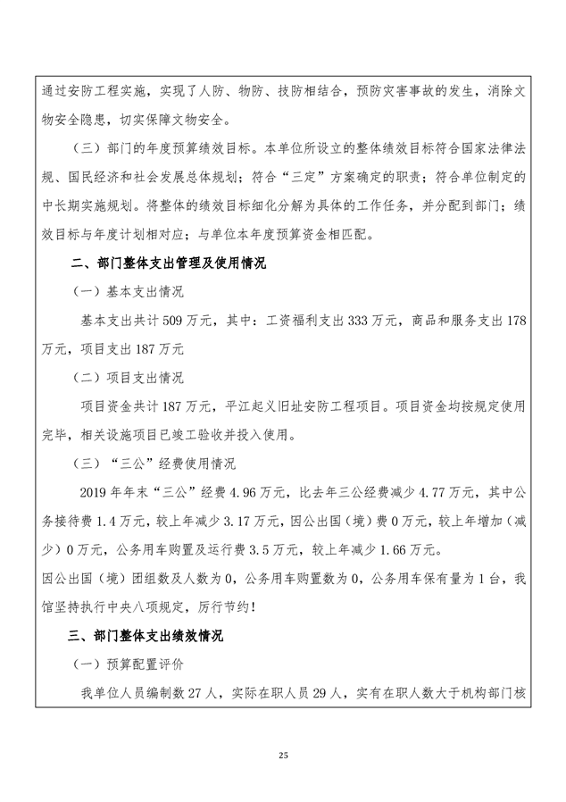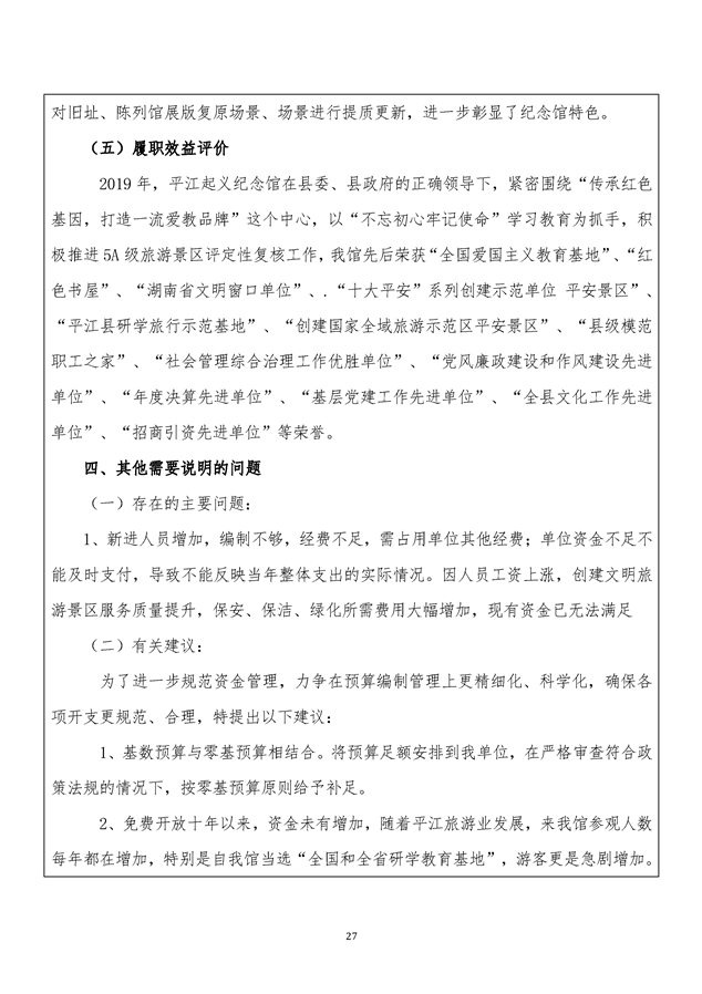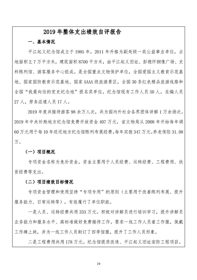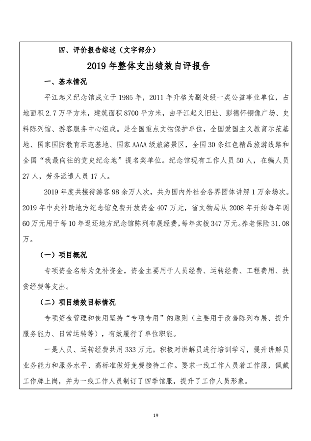 平江县起义纪念馆管理处2019年度整体支出绩效自评