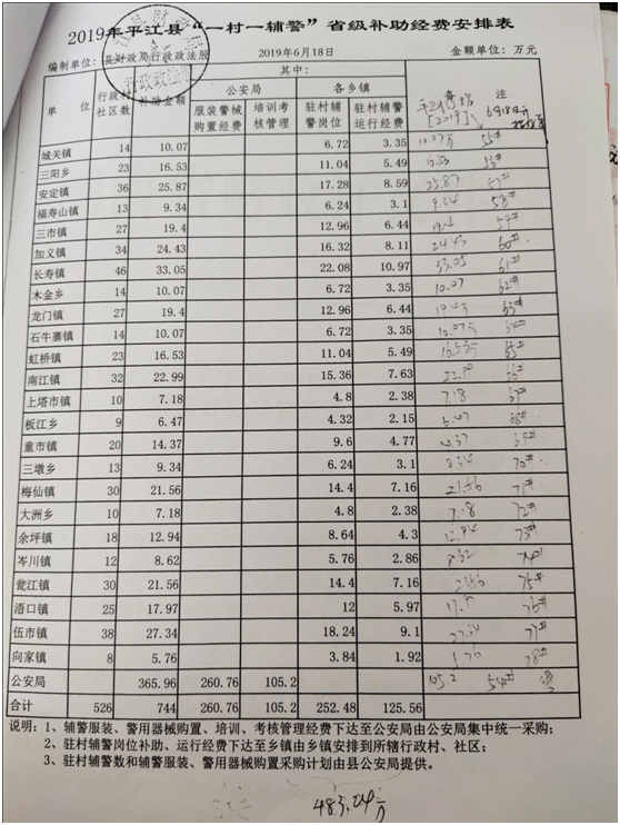 2019年“一村一辅警”县级补助经费安排表