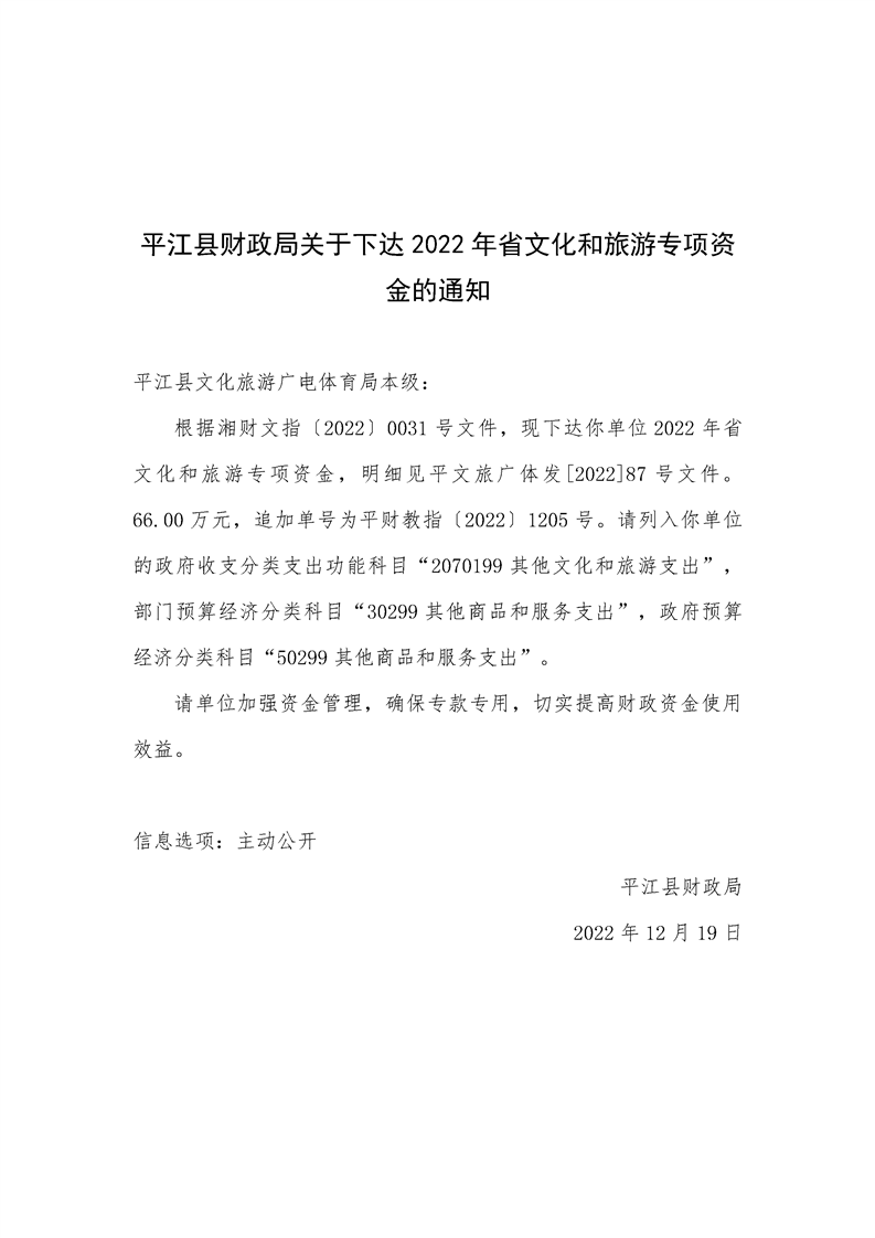 平江县财政局关于下达2022年省文化和旅游专项资金的通知