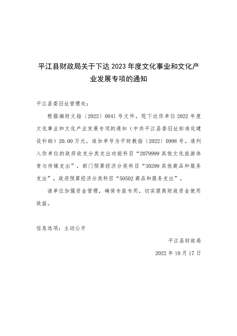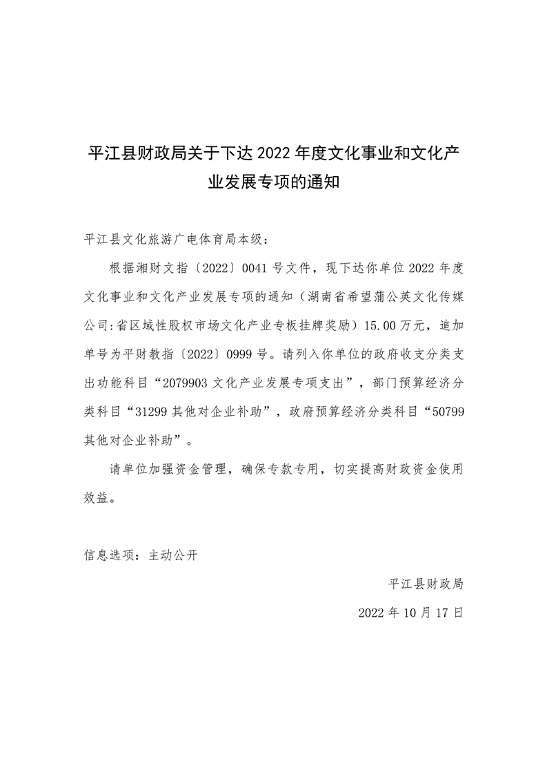 平江县财政局关于下达2022年度文化事业和文化产业发展专项的通知