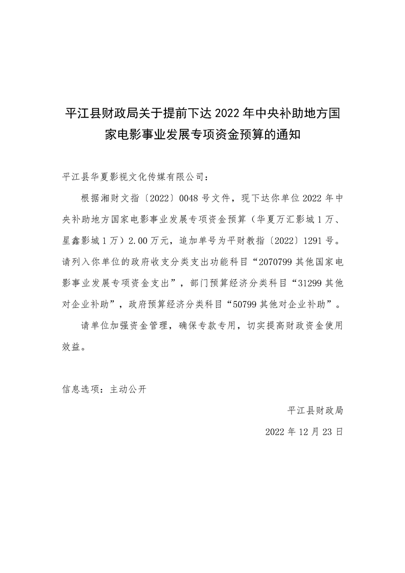 平江县财政局关于提前下达2022年中央补助地方国家电影事业发展专项资金预算的通知
