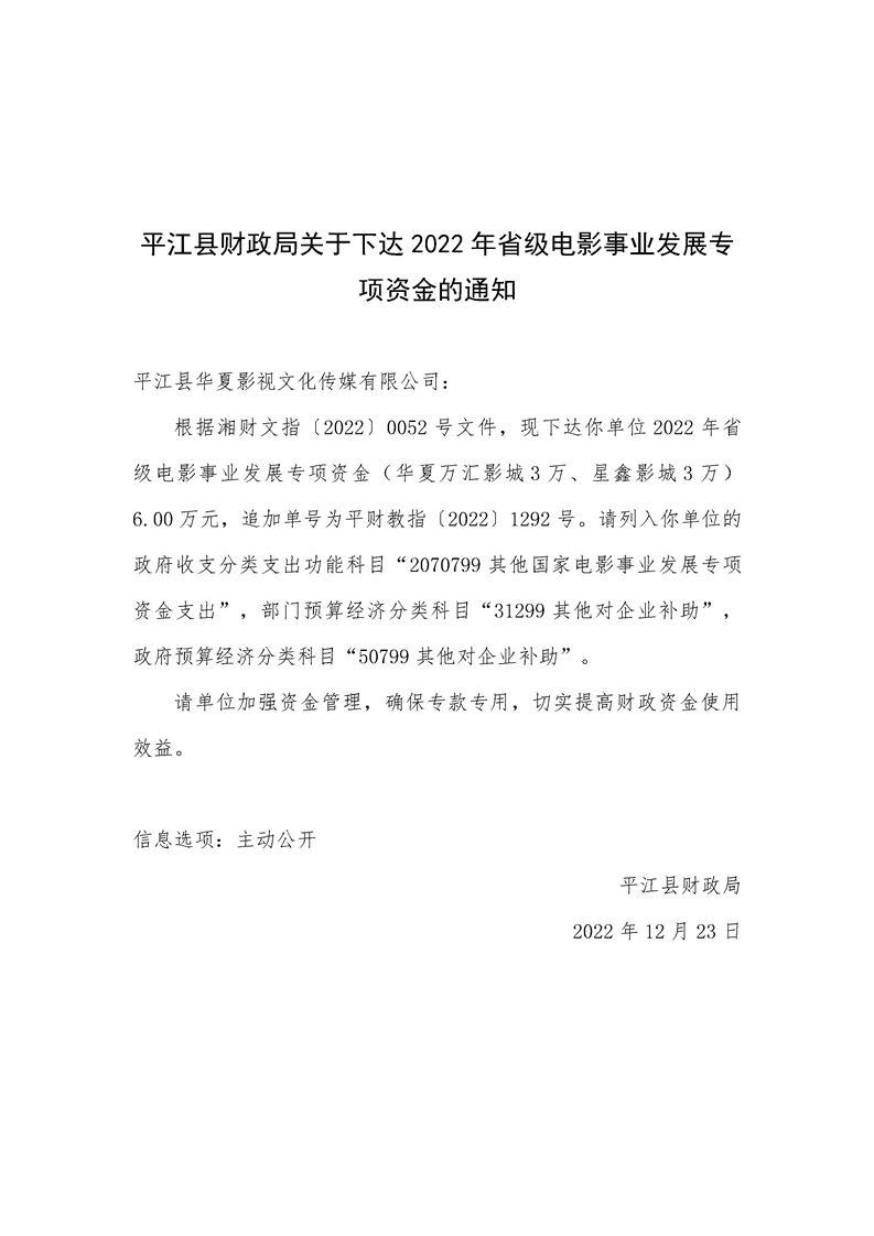 平江县财政局关于下达2022年省级电影事业发展专项资金的通知