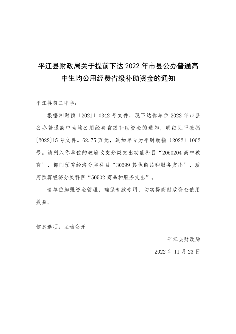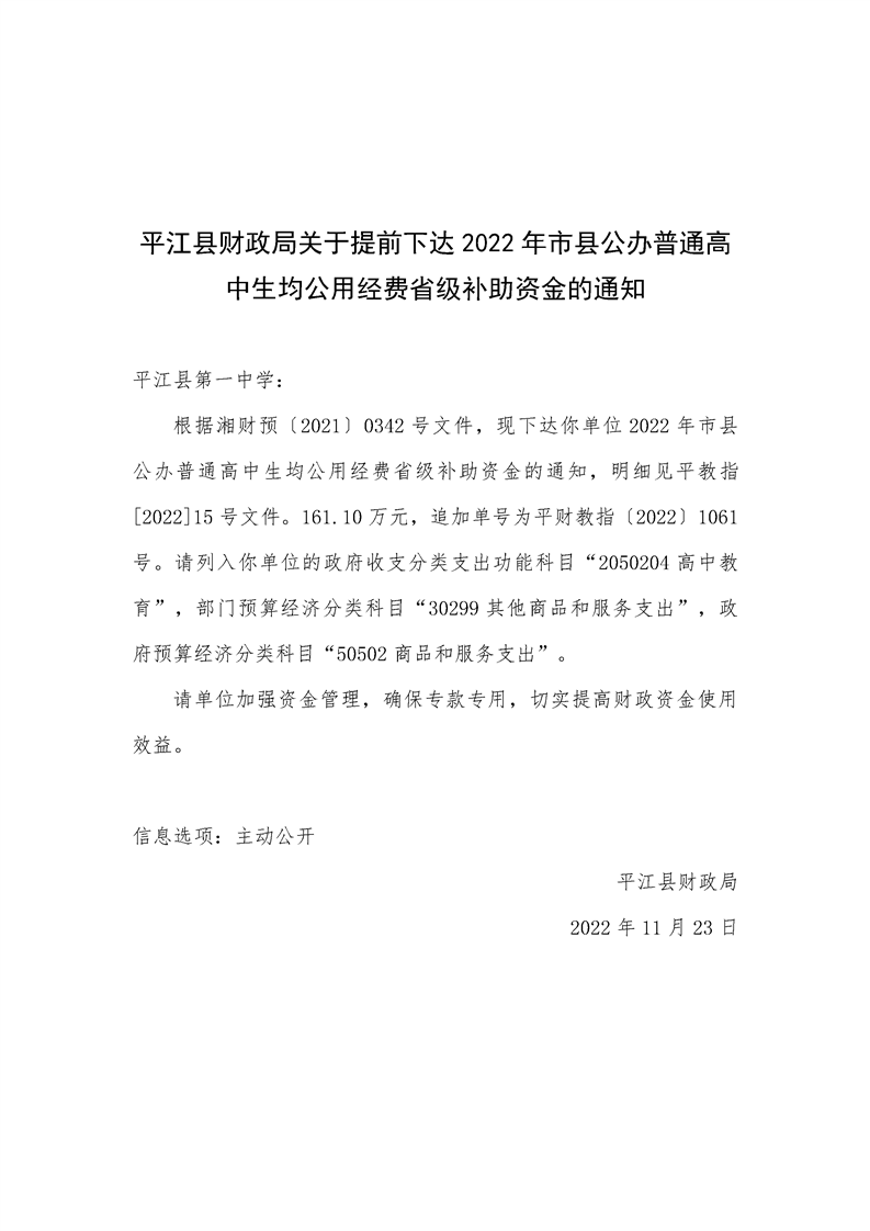 平江县财政局关于提前下达2022年市县公办普通高中生均公用经费省级补助资金