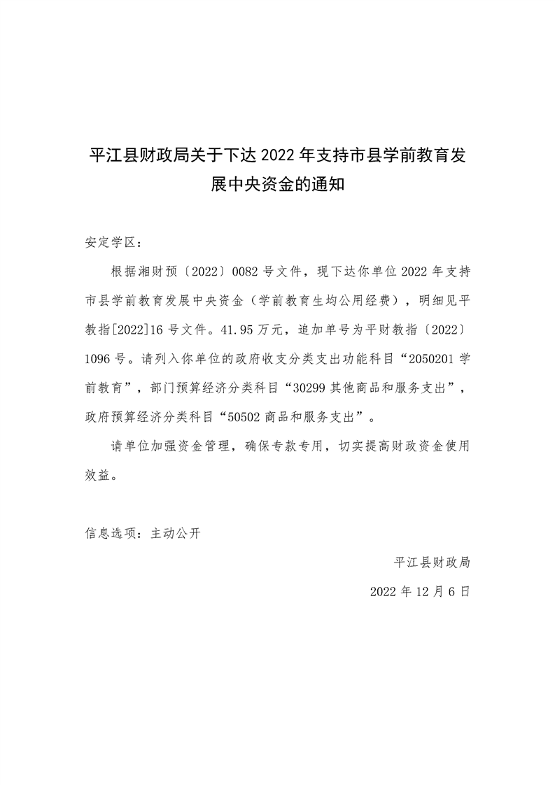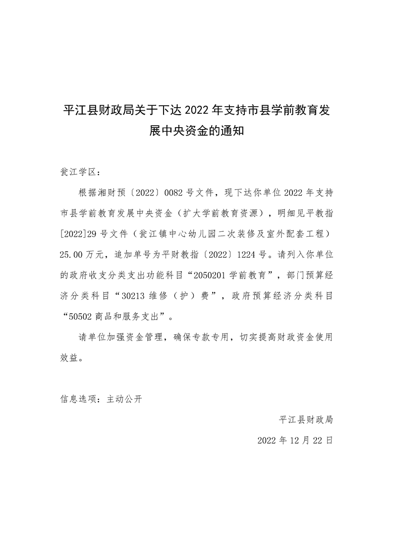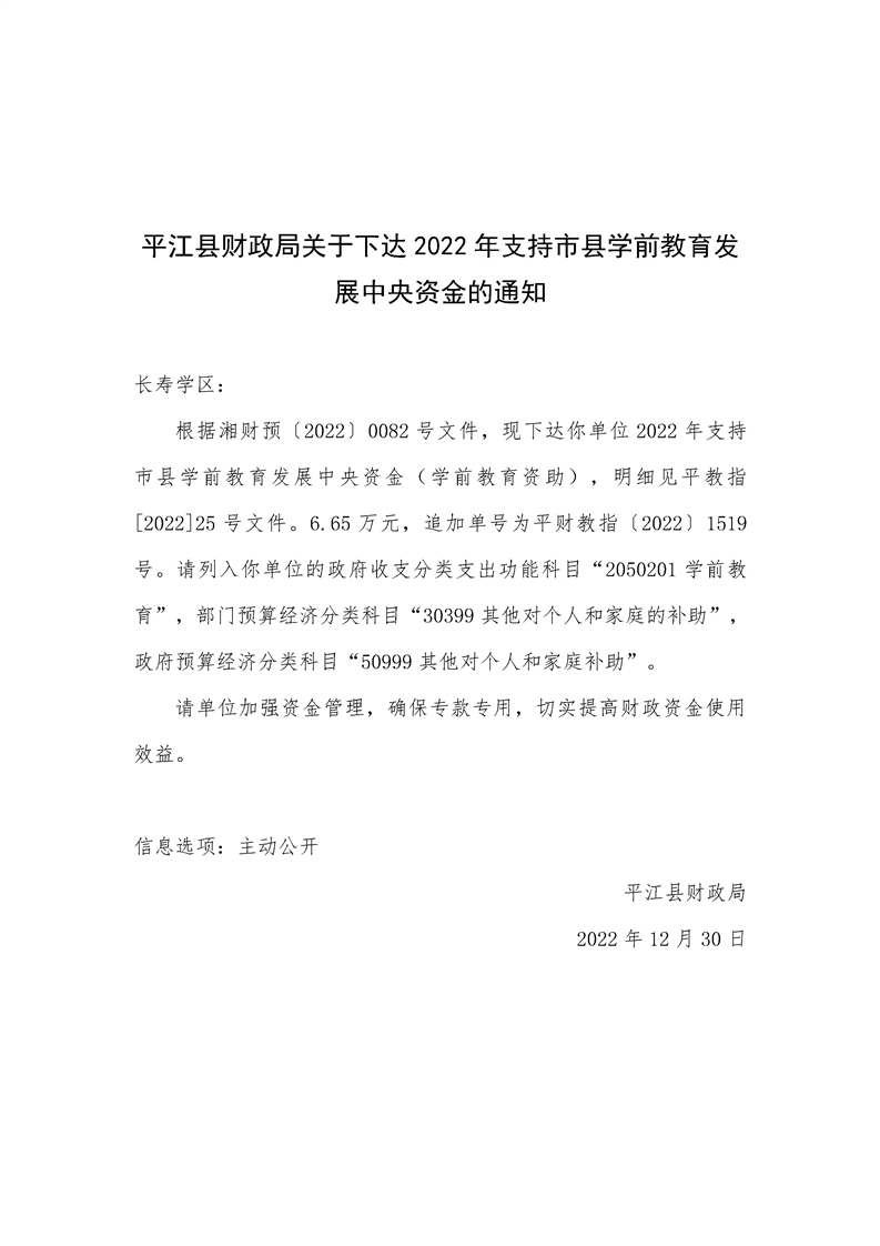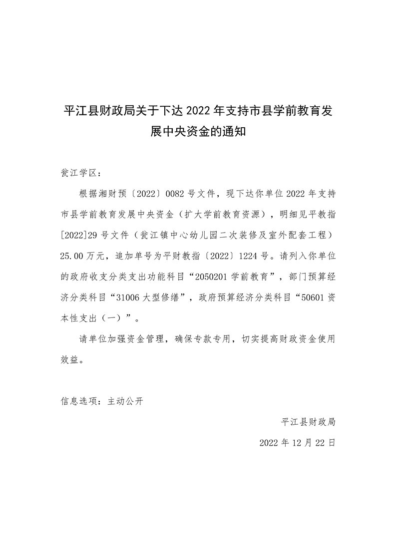 平江县财政局关于下达2022年支持市县学前教育发展中央资金的通知