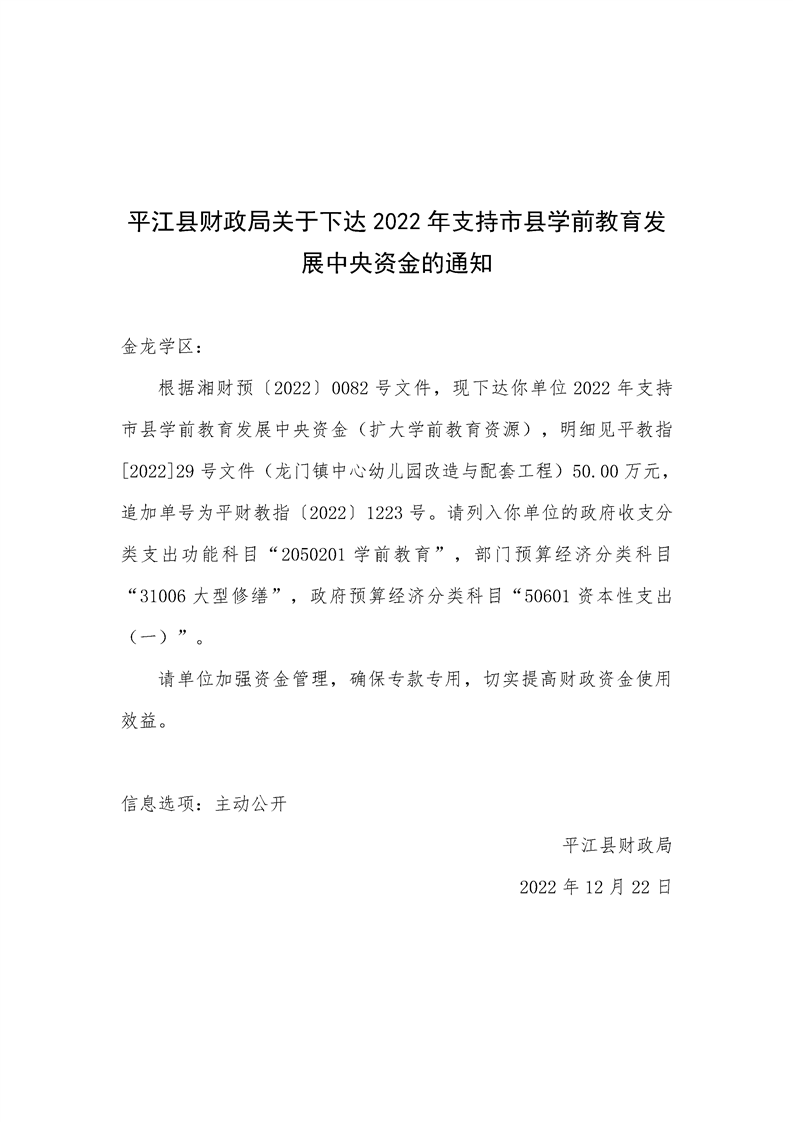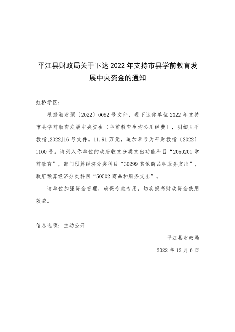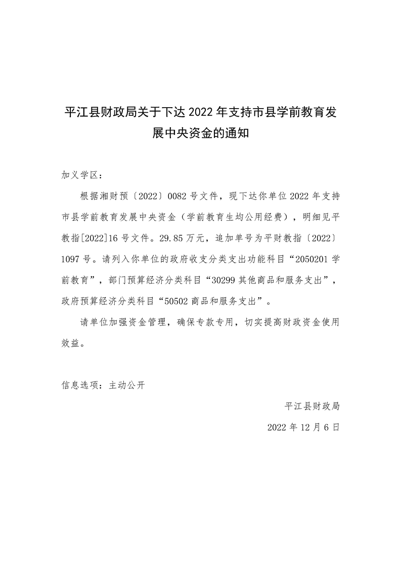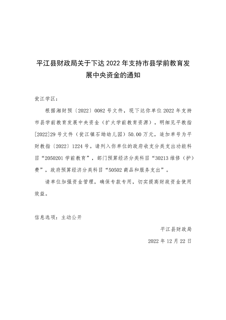 平江县财政局关于下达2022年支持市县学前教育发展中央资金的通知