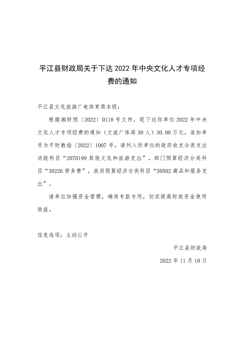 平江县财政局关于下达2022年中央文化人才专项经费的通知