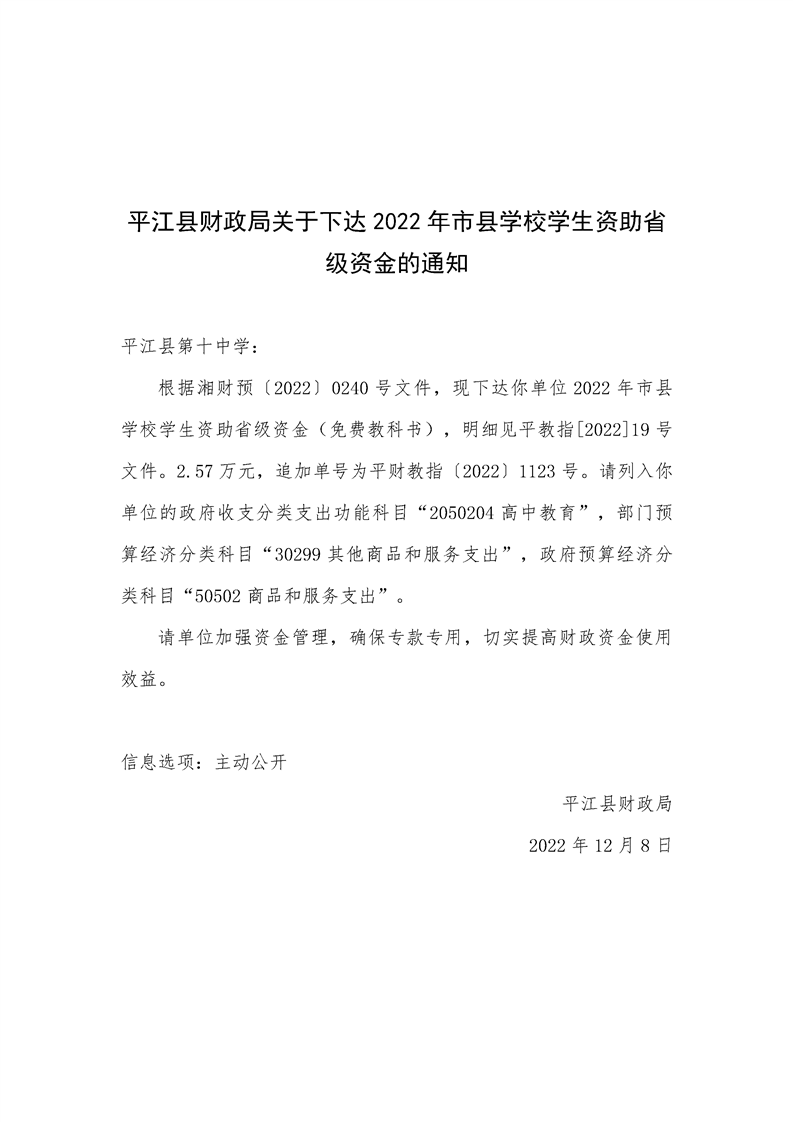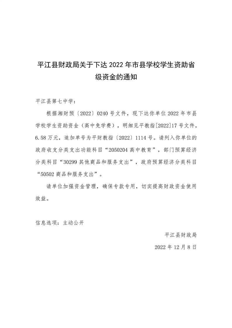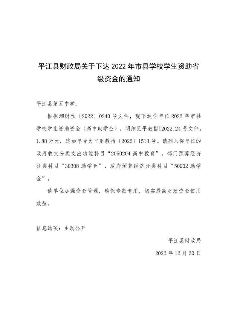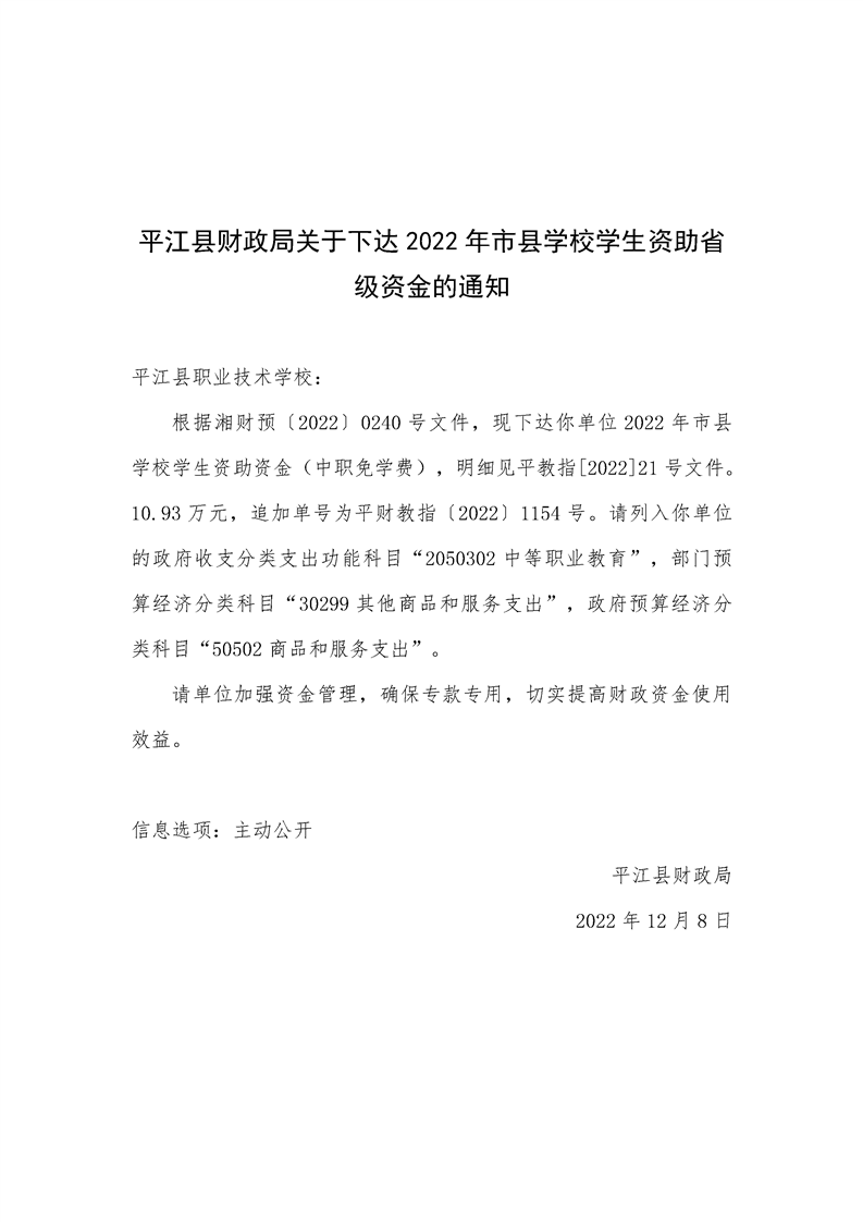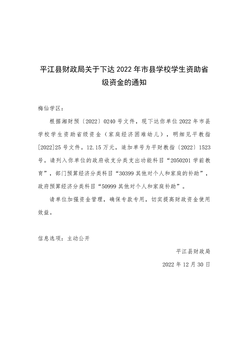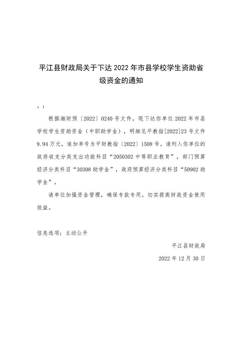 平江县财政局关于下达2022年市县学校学生资助省级资金的通知