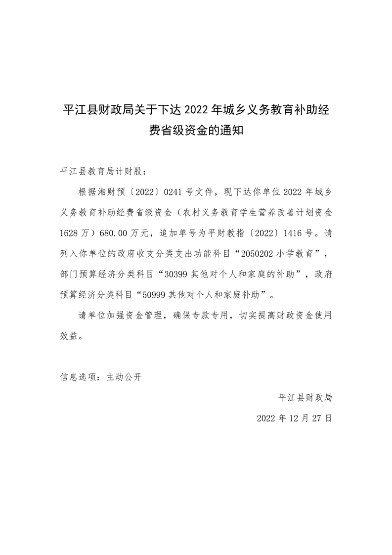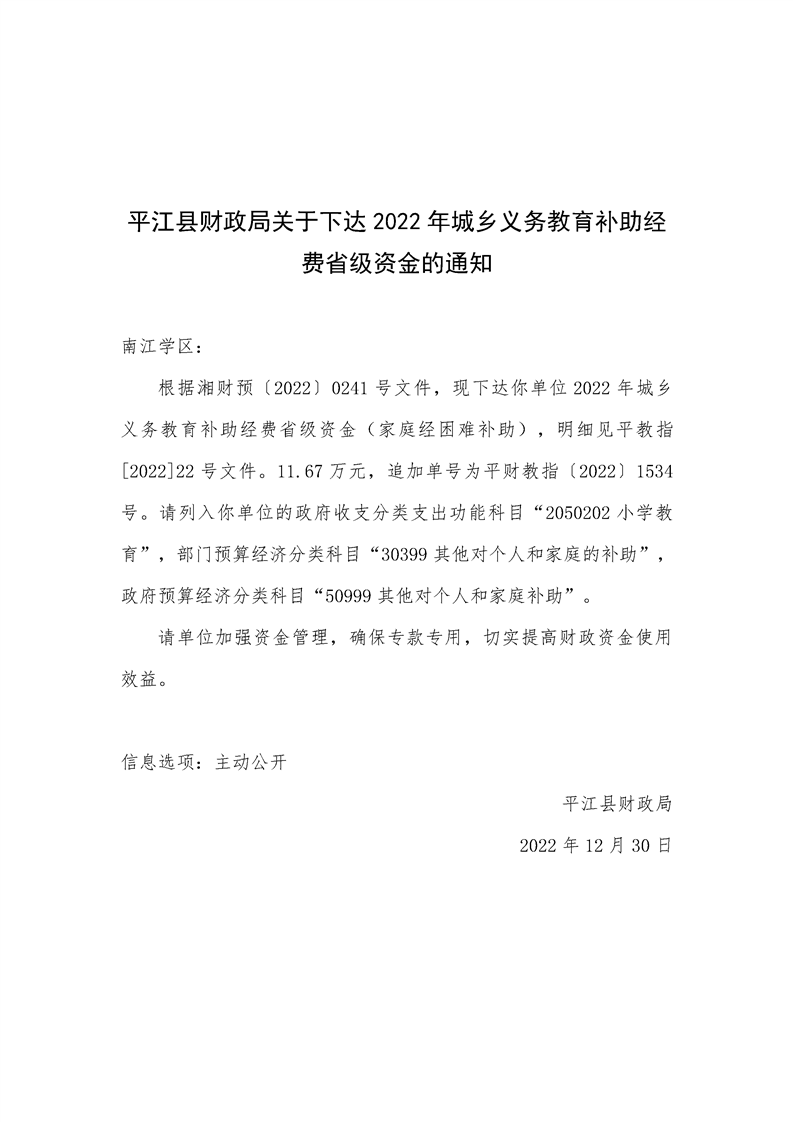 平江县财政局关于下达2022年城乡义务教育补助经费省级资金的通知