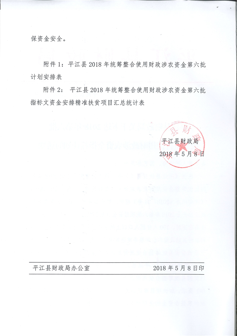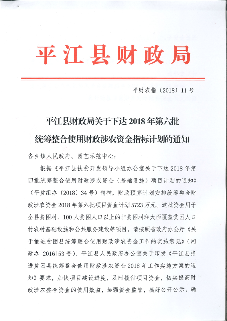 关于下达2018年第六批统筹整合使用财政涉农资金指标计划的通知-平财农指[2018]11号