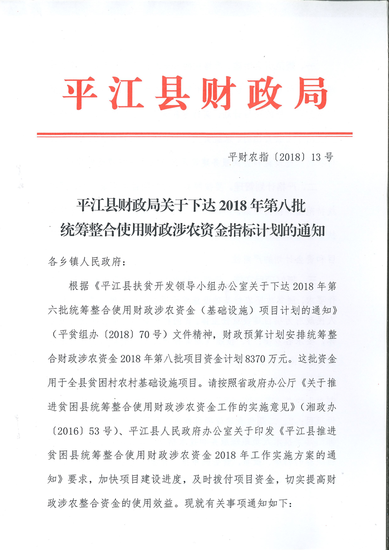 关于下达2018年第八批统筹整合使用财政涉农资金指标计划的通知-平财农指[2018]13号