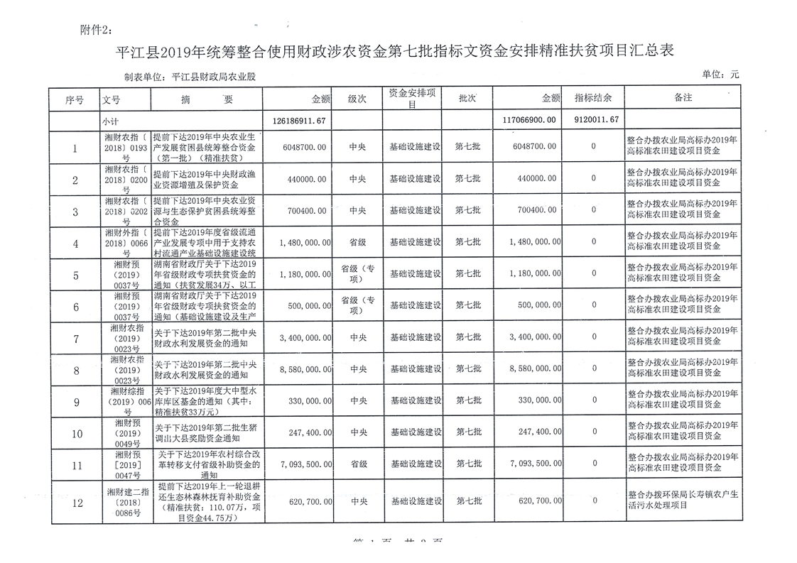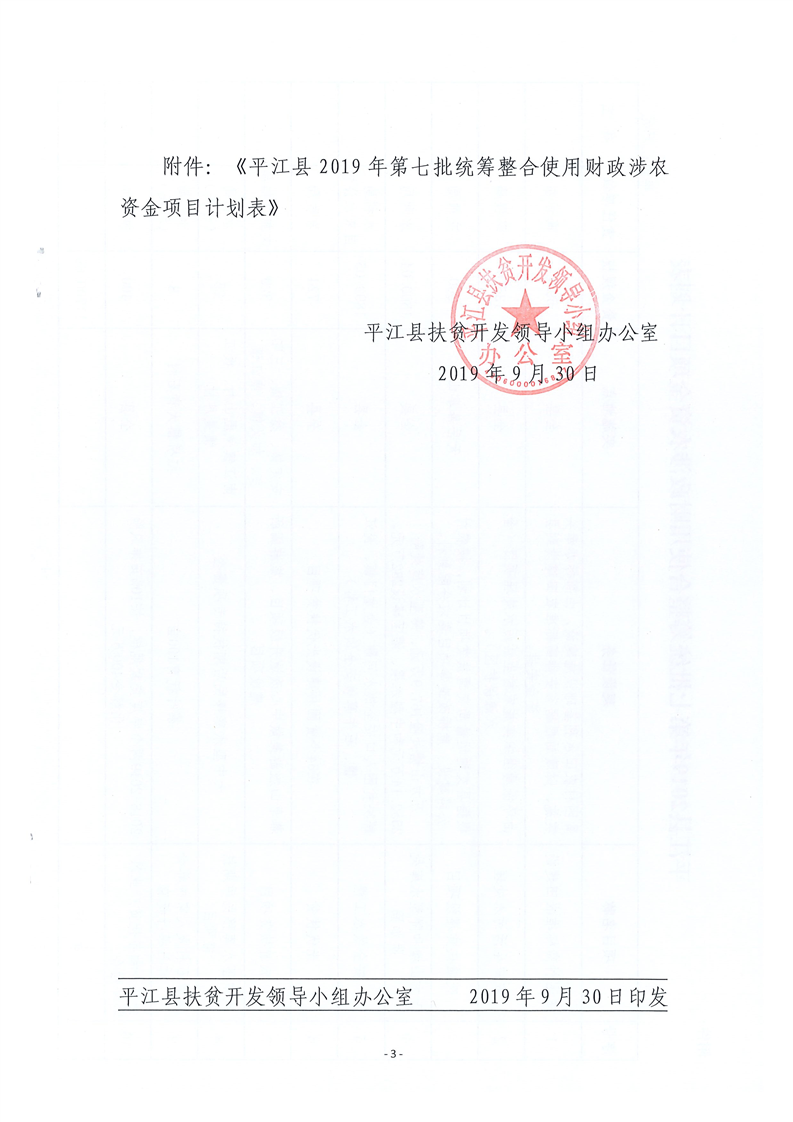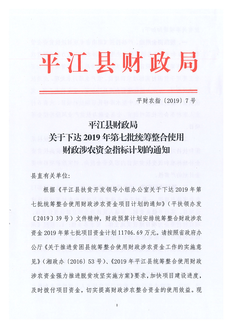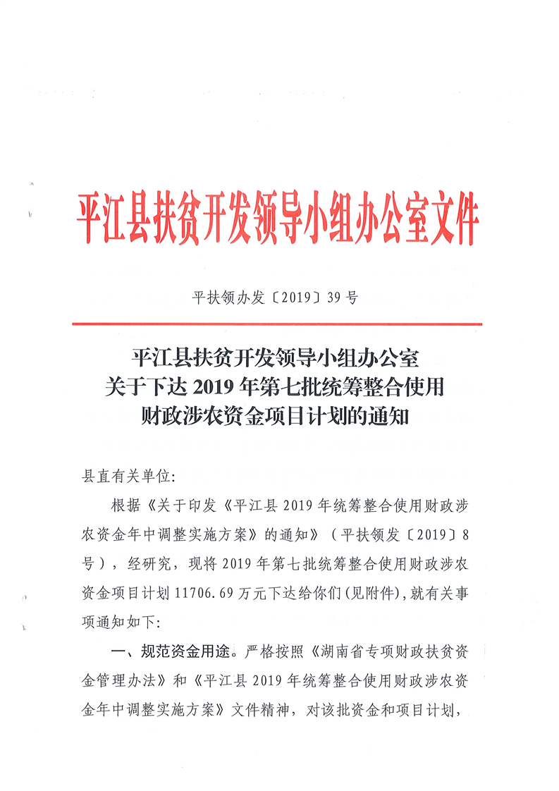关于下达2019年第七批统筹整合使用财政涉农资金指标计划的通知(平扶领办发[2019]39号)