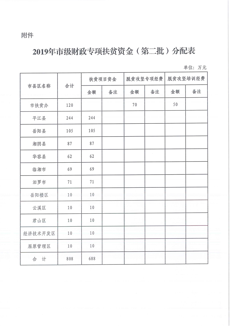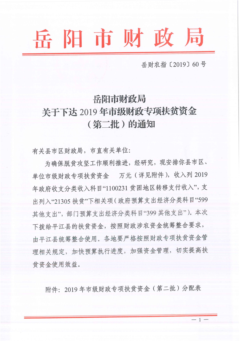 岳阳市财政局关于下达2019年市级财政专项扶贫资金(第二批)的通知(岳财农指〔2019〕60号)
