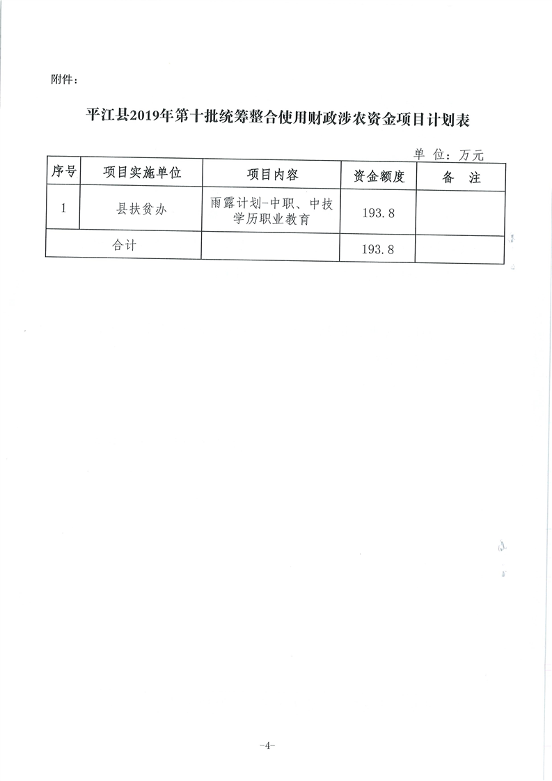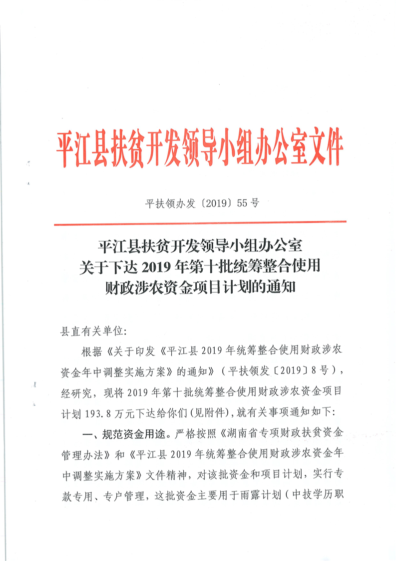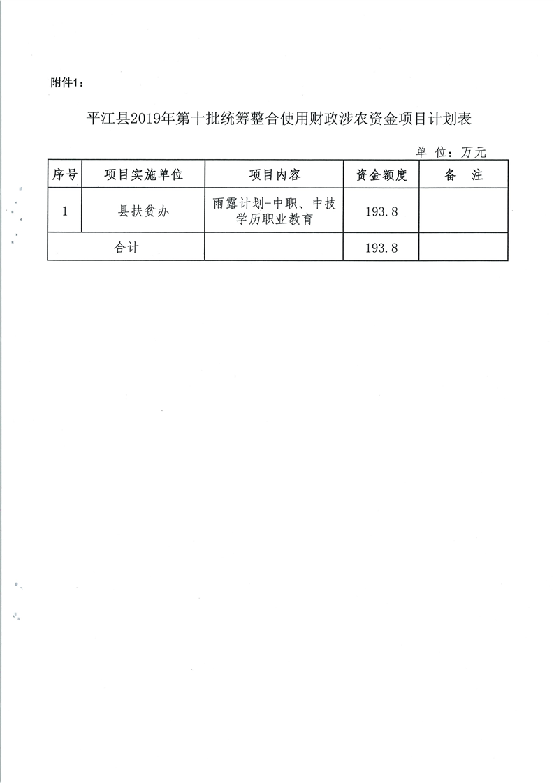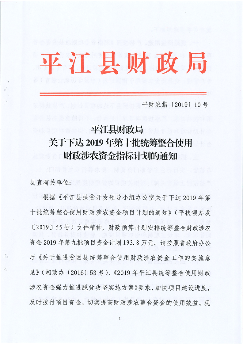 关于下达2019年第十批统筹整合使用财政涉农资金指标计划的通知-平财农指[2019]10号
