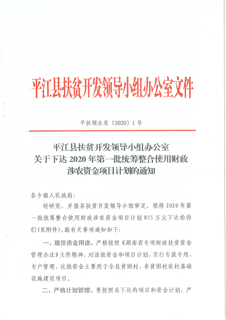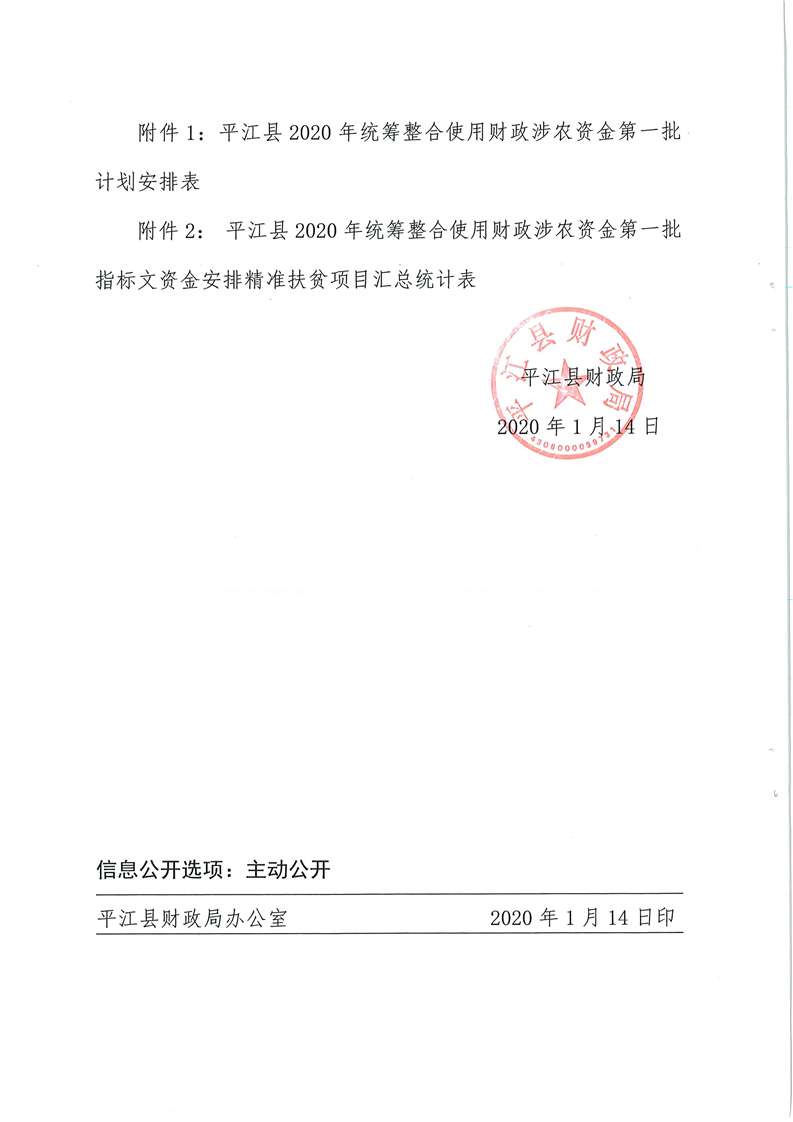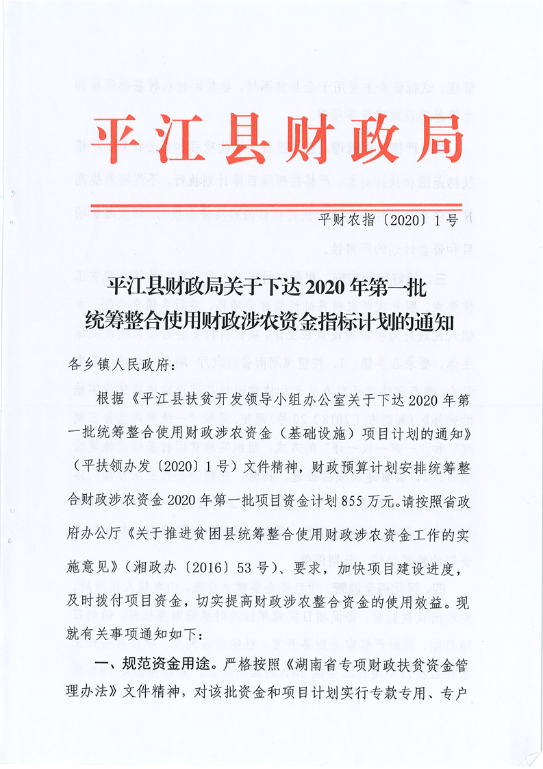 关于下达2020年第一批统筹整合使用财政涉农资金指标计划的通知-平财农指[2020]1号