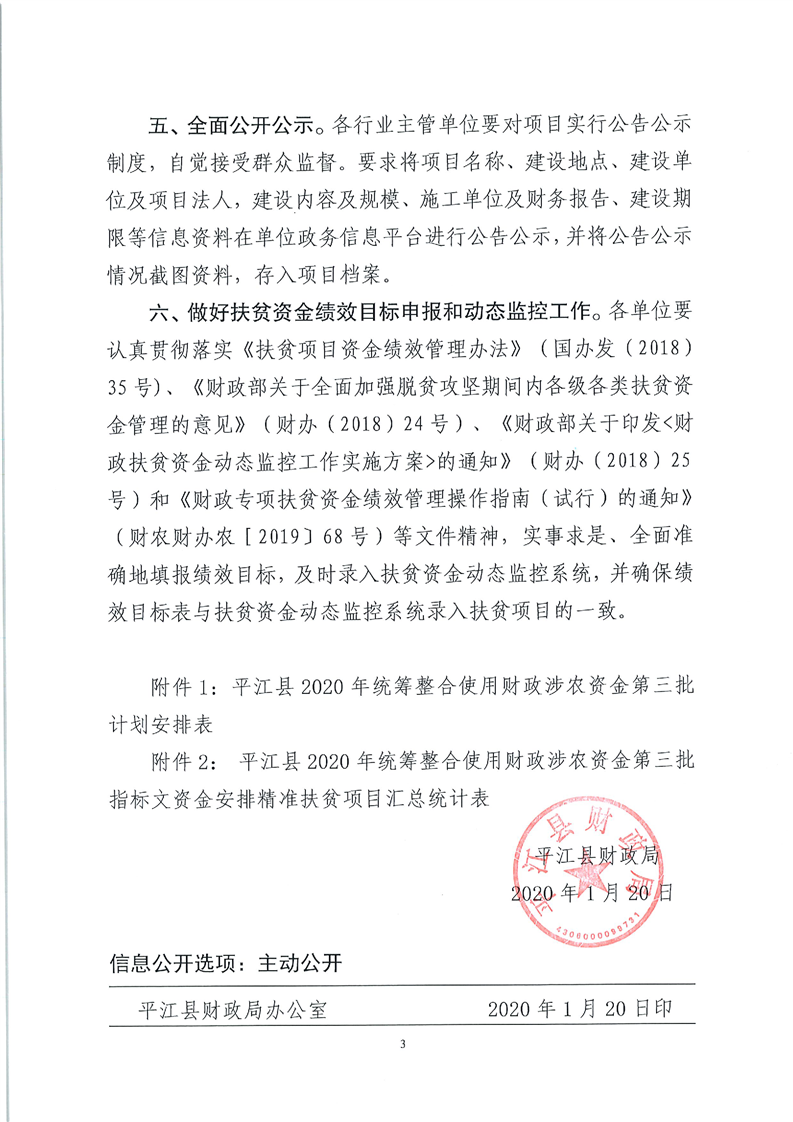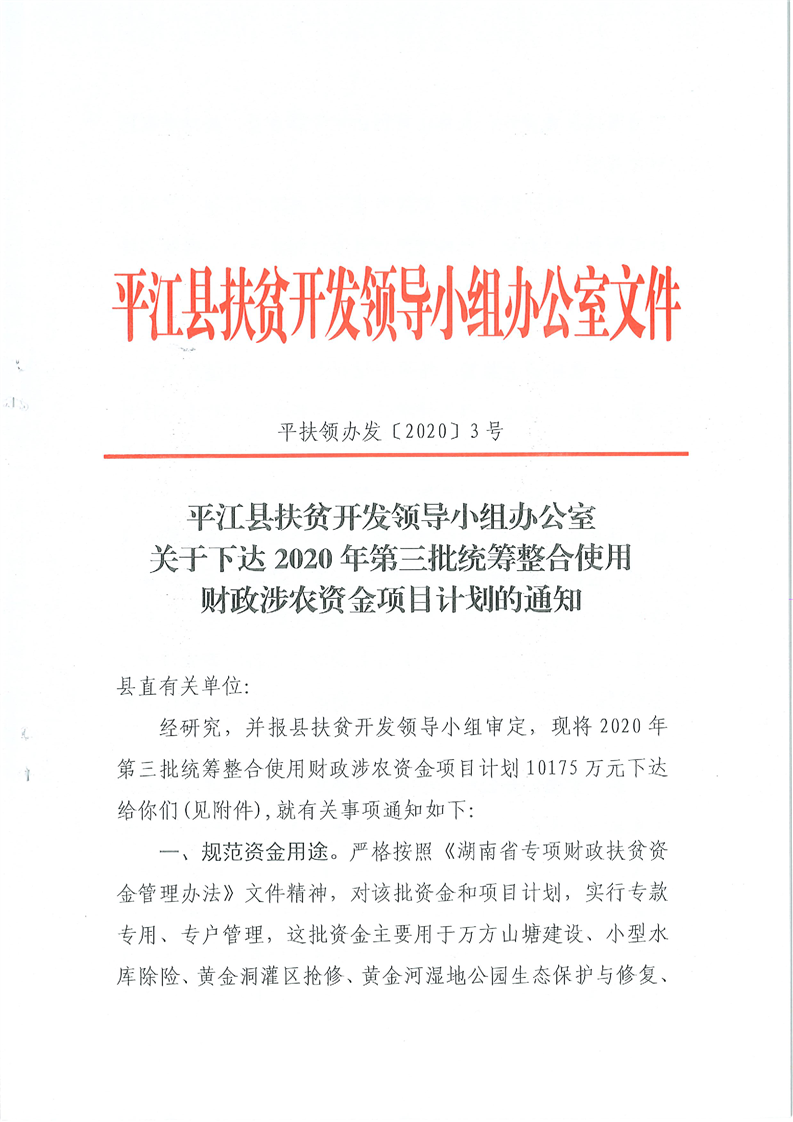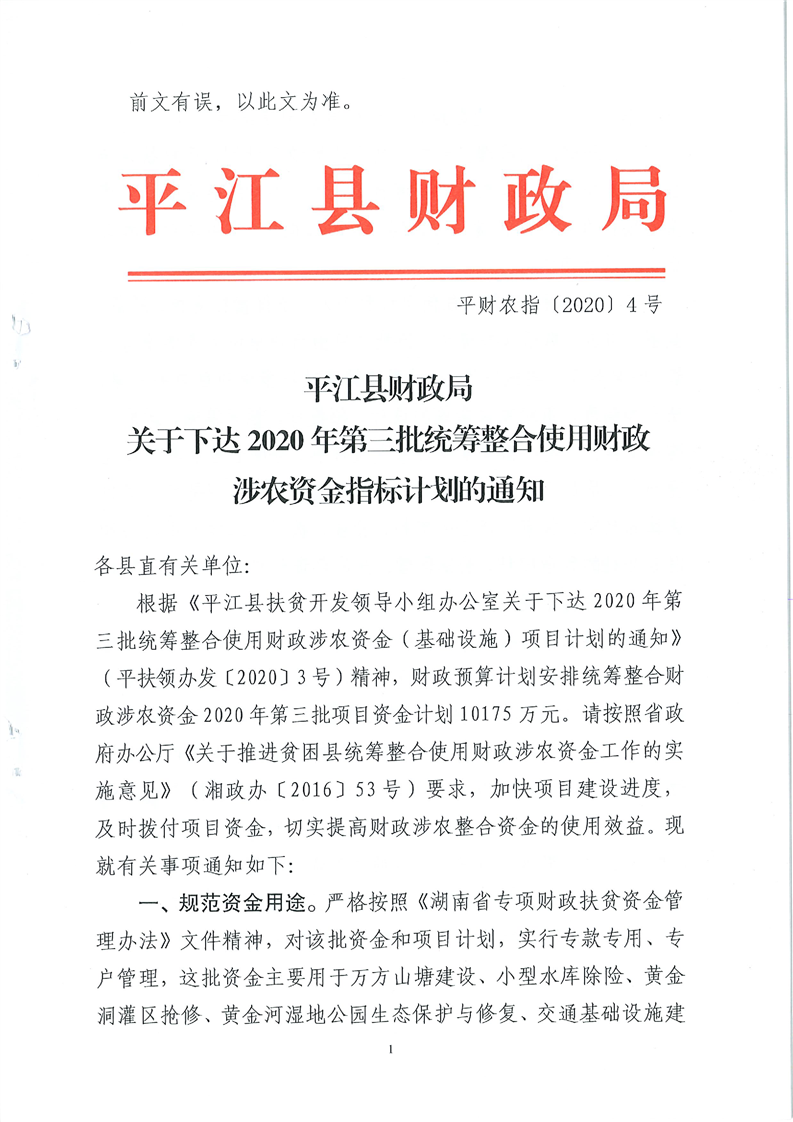 关于下达2020年第三批统筹整合使用财政涉农资金指标计划的通知-平财农指[2020]4号