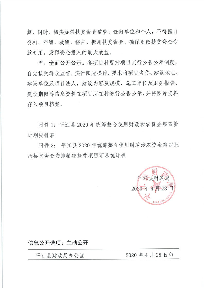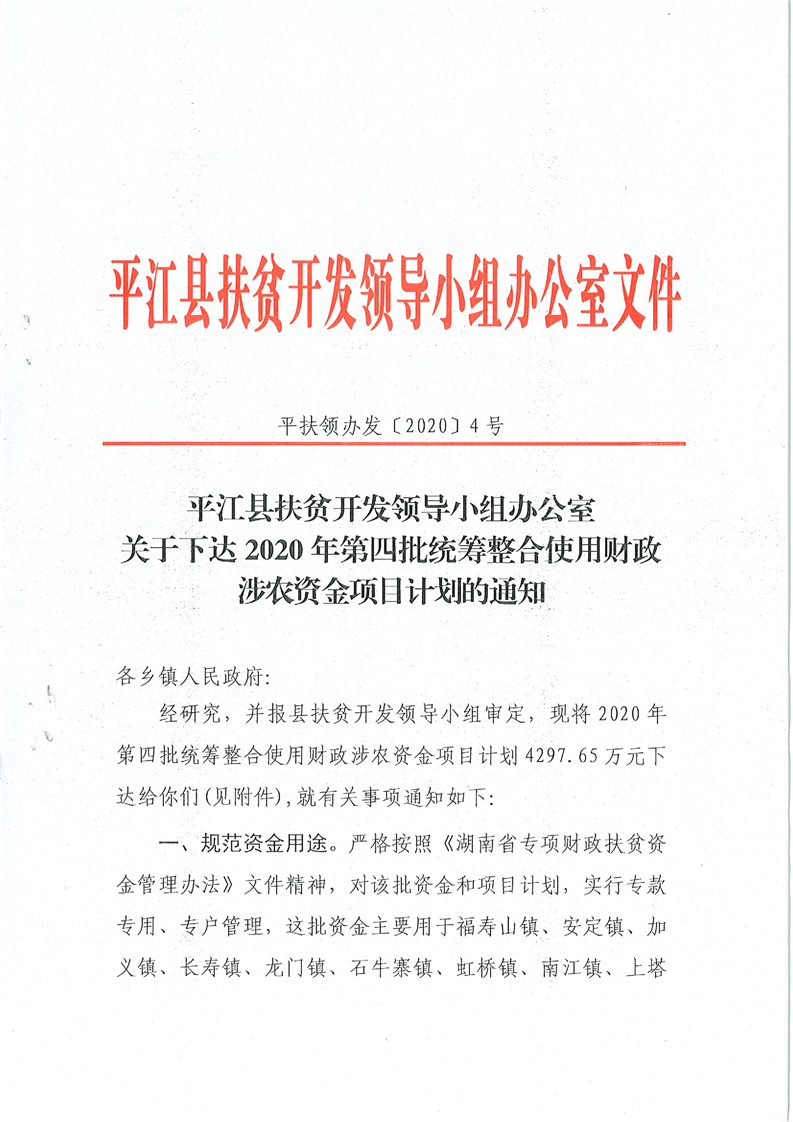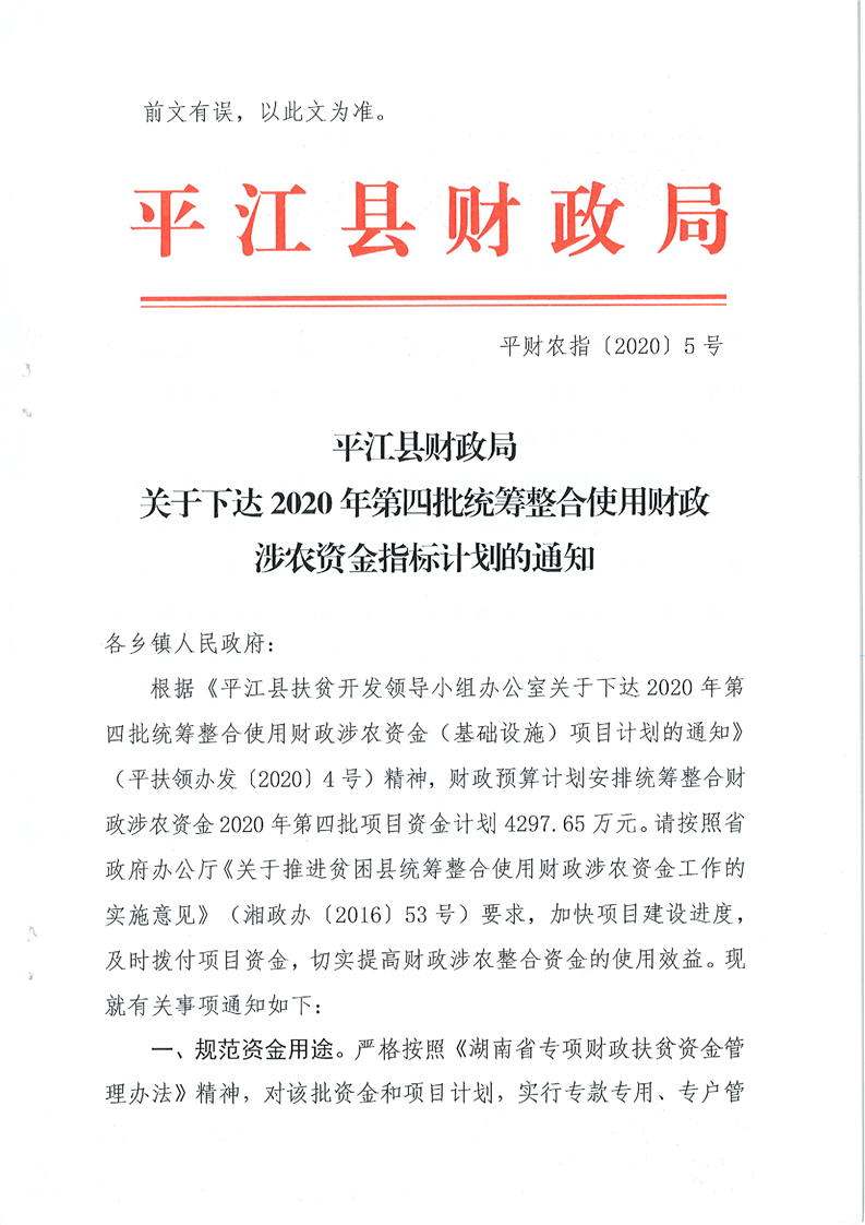 关于下达2020年第四批统筹整合使用财政涉农资金指标计划的通知-平财农指[2020]5号