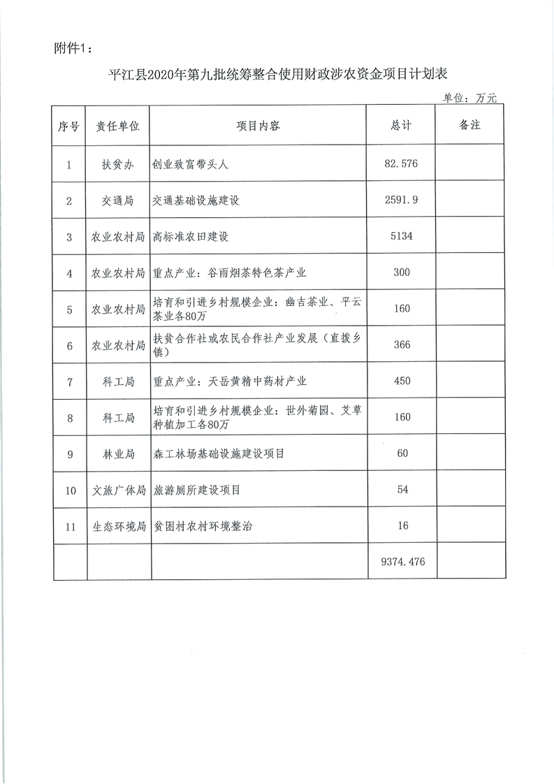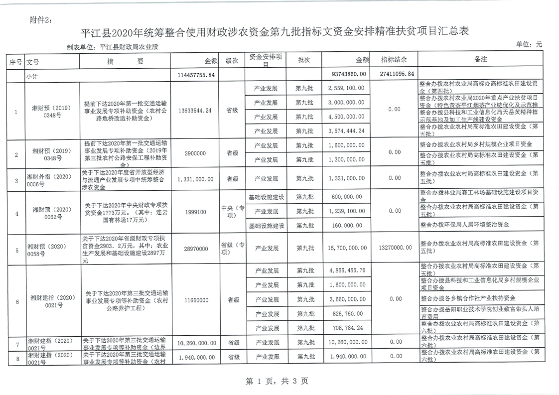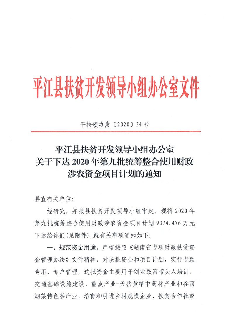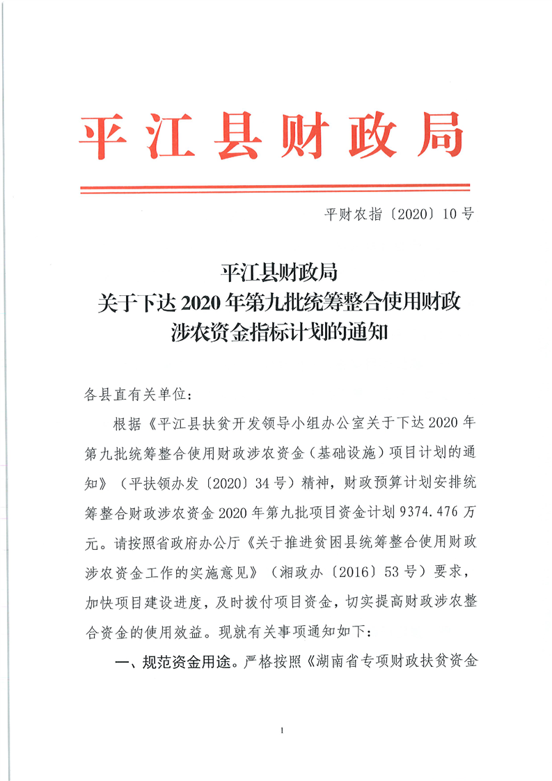 关于下达2020年第九批统筹整合使用财政涉农资金指标计划的通知-平财农指[2020]10号