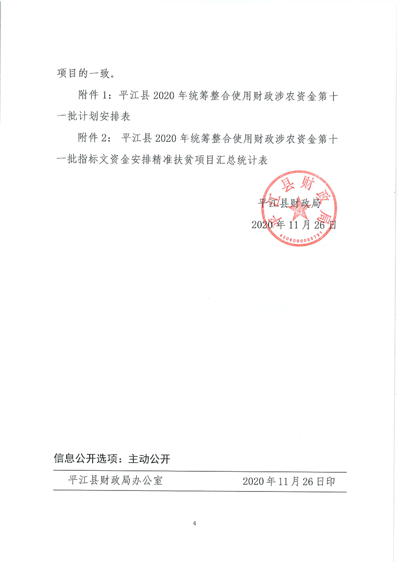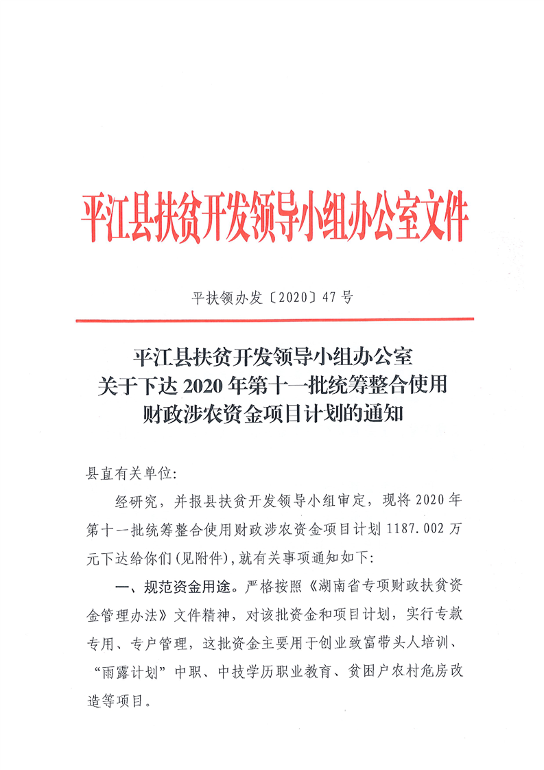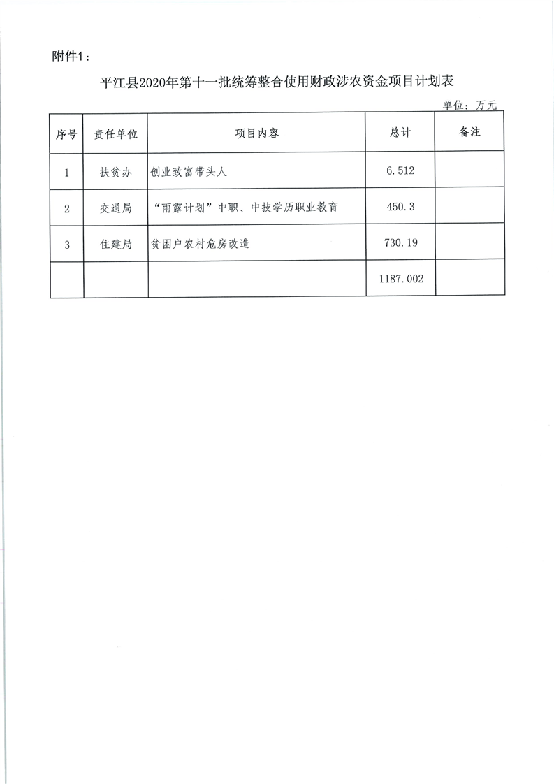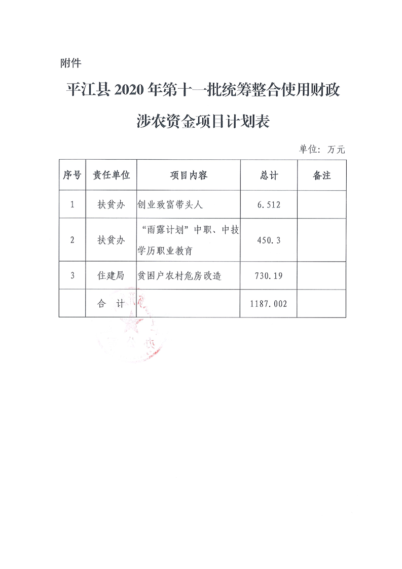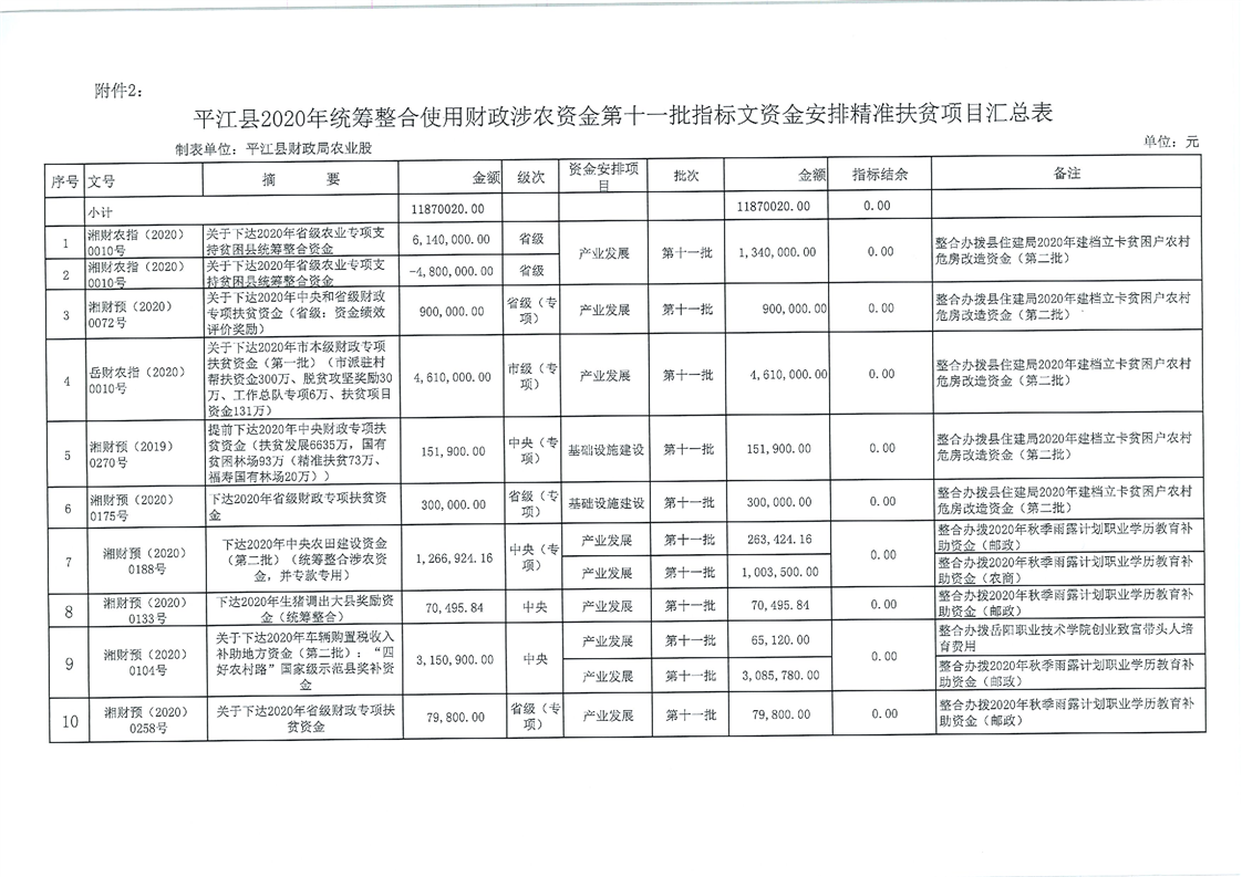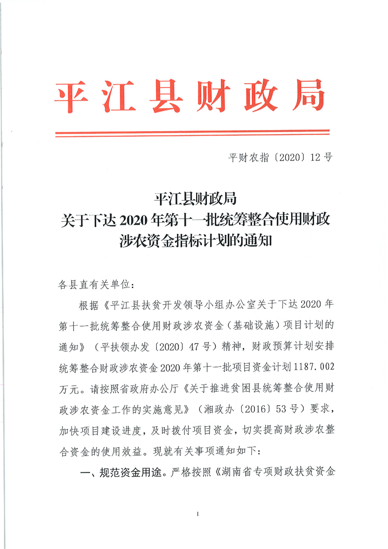 关于下达2020年第十一批统筹整合使用财政涉农资金指标计划的通知-平财农指[2020]12号
