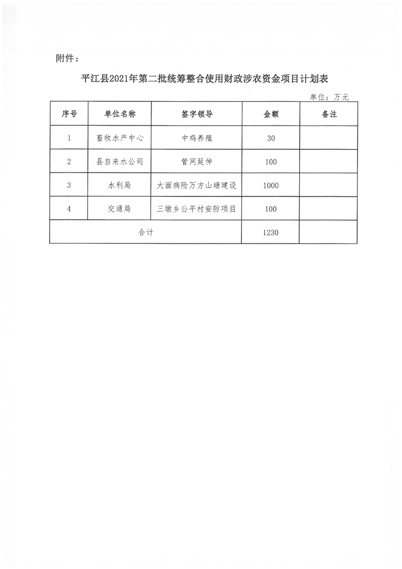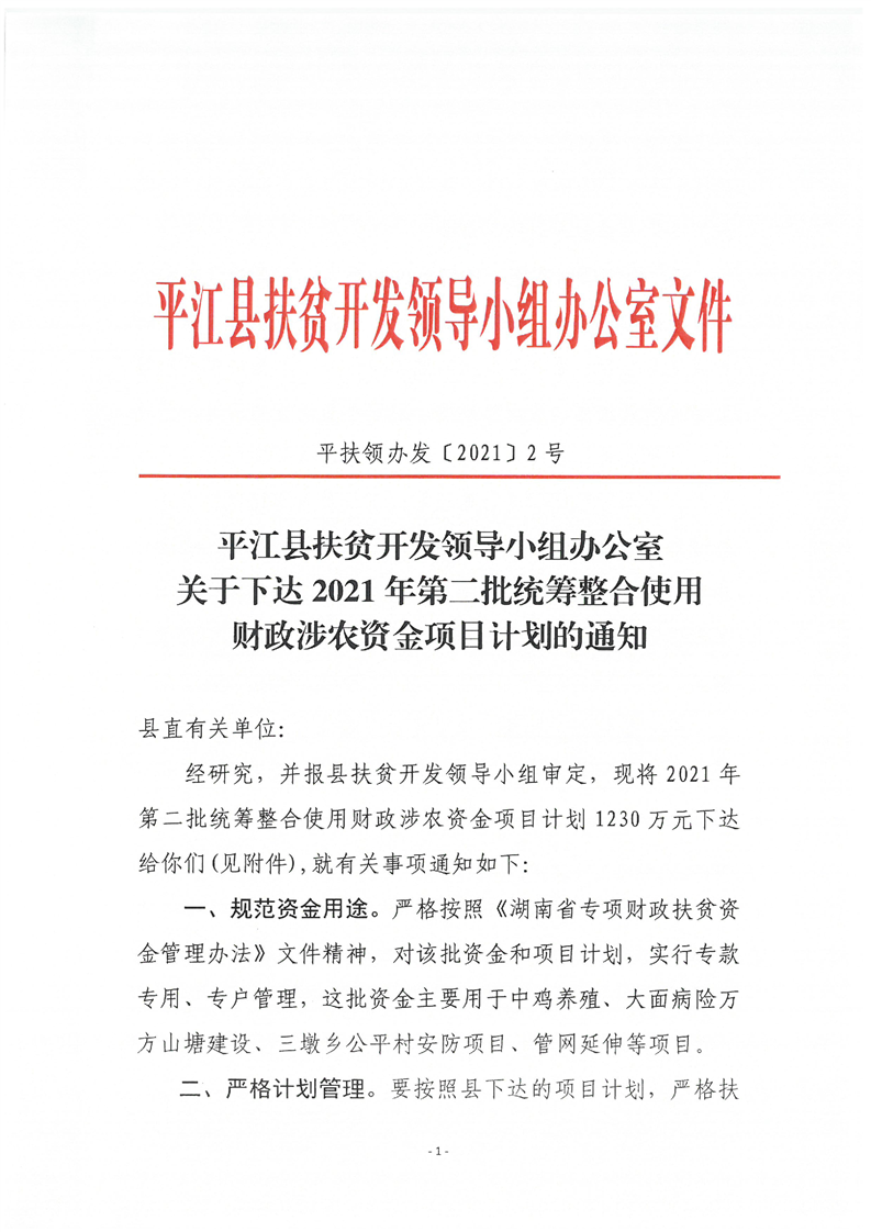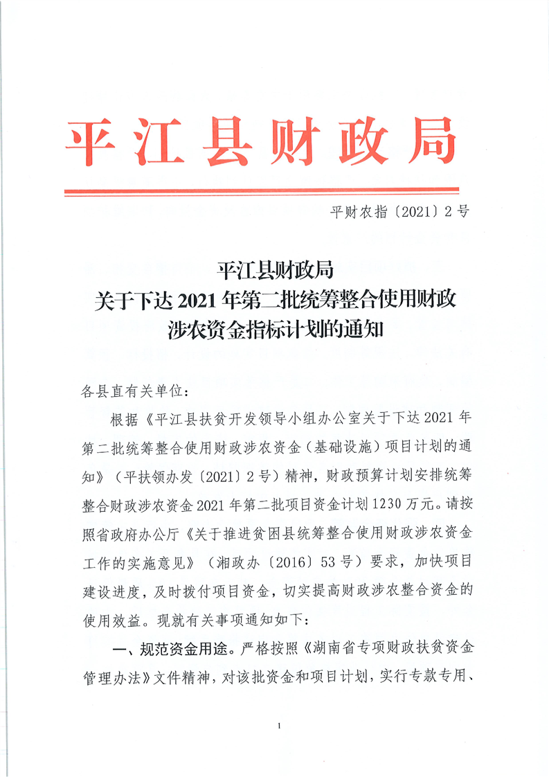 平财农指[2021]2号关于下达2021年第二批统筹整合使用财政涉农资金项目计划的通知