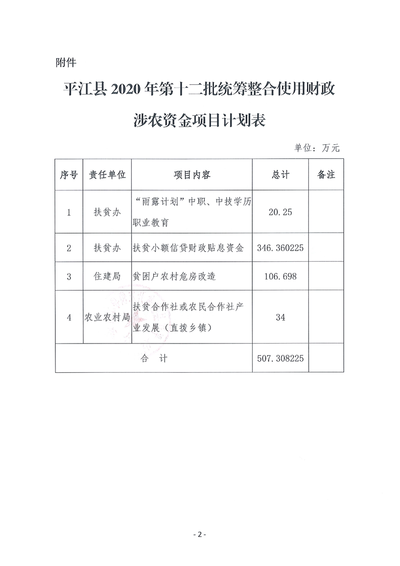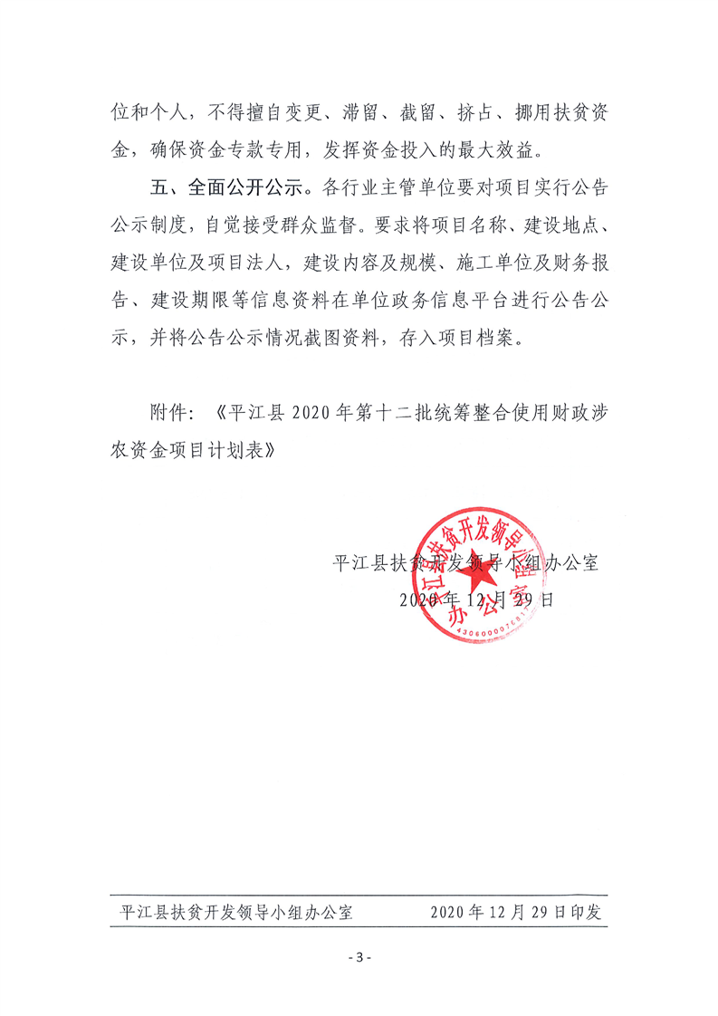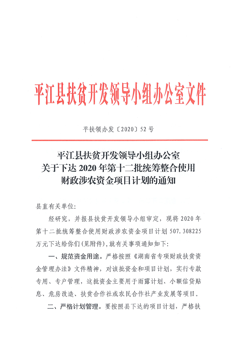 关于下达2020年第十二批统筹整合使用财政涉农资金指标计划的通知-平财农指[2020]14号