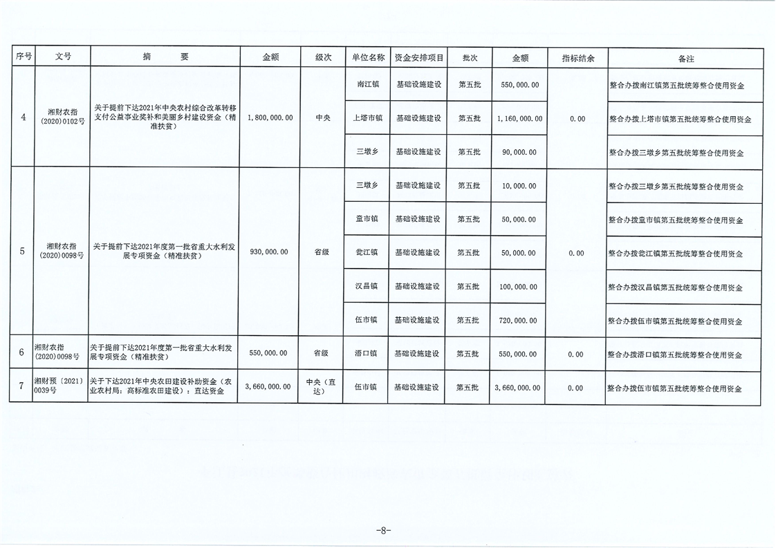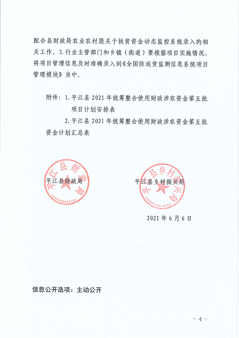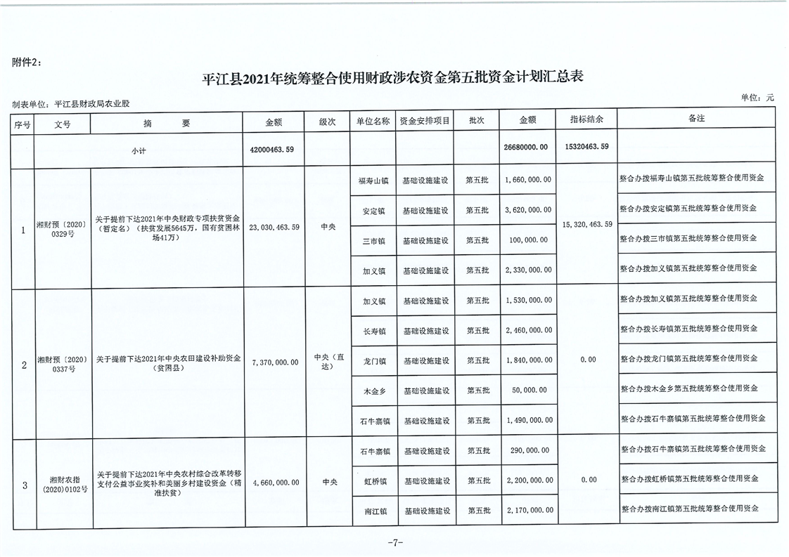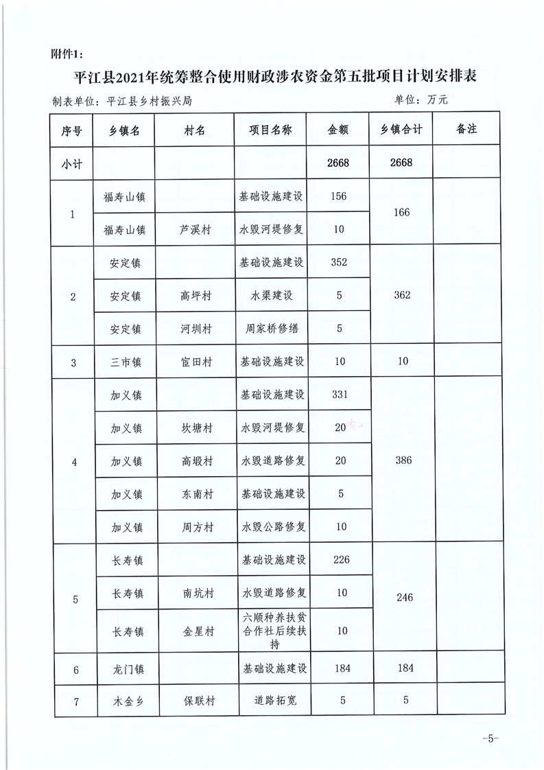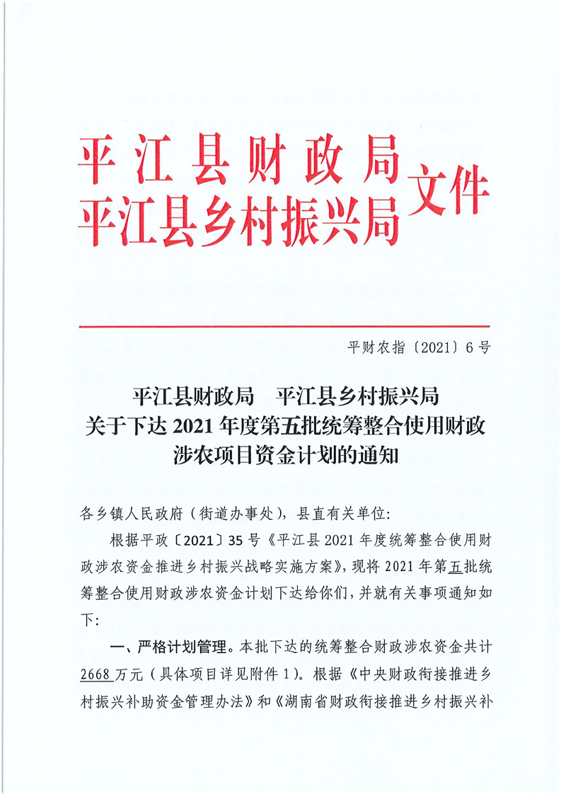 平财农指〔2021〕6号 关于下达2021年度第五统筹整合使用财政涉农项目资金计划的通知