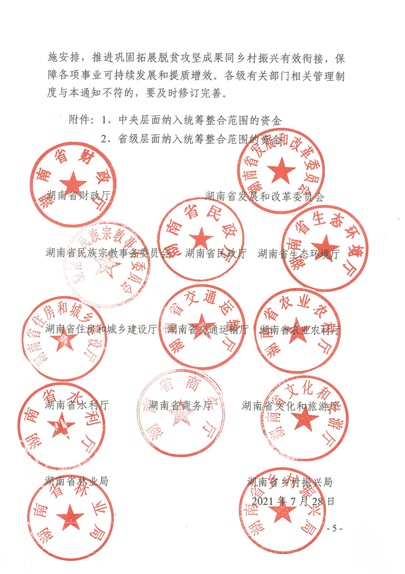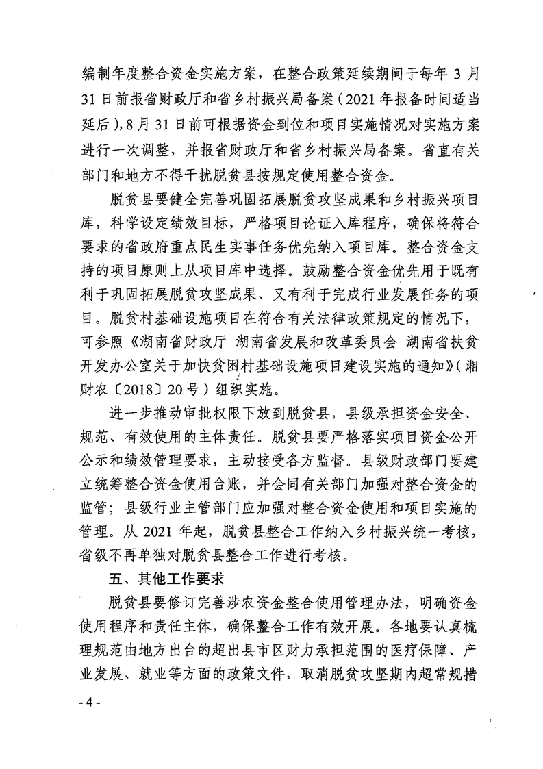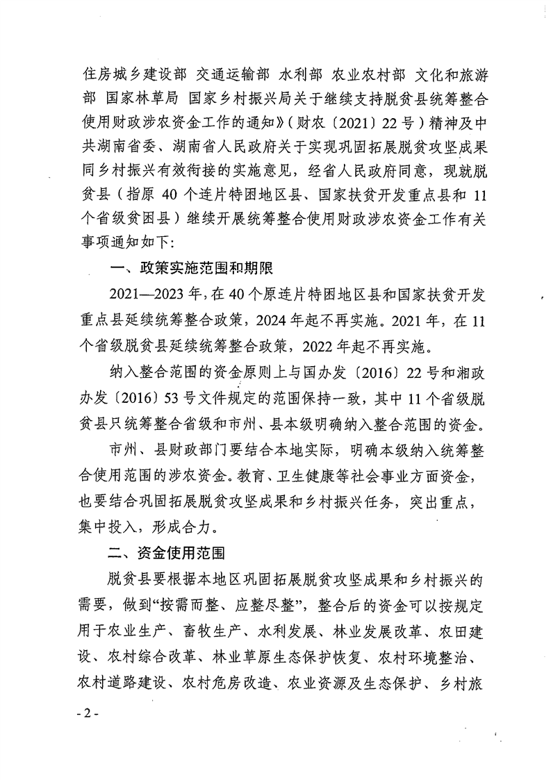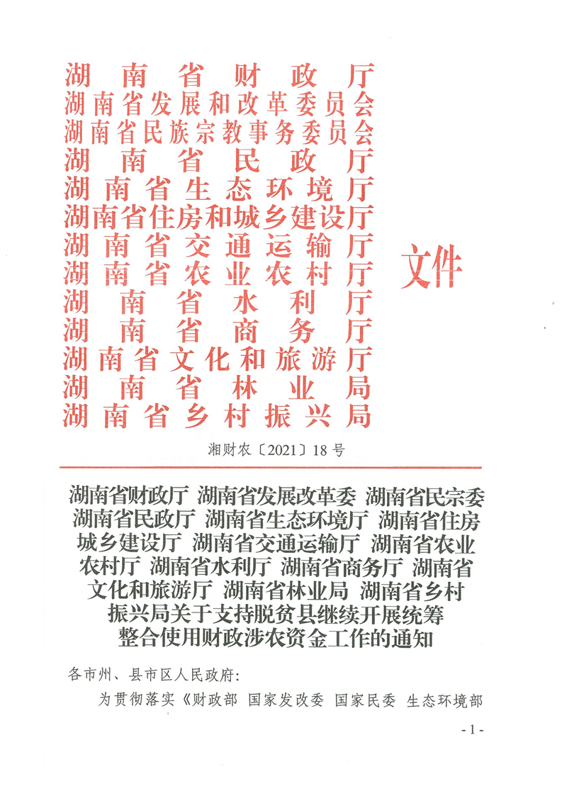 (湘财农〔2021〕18号)《关于继续支持脱贫县统筹整合使用财政涉农资金工作的通知》