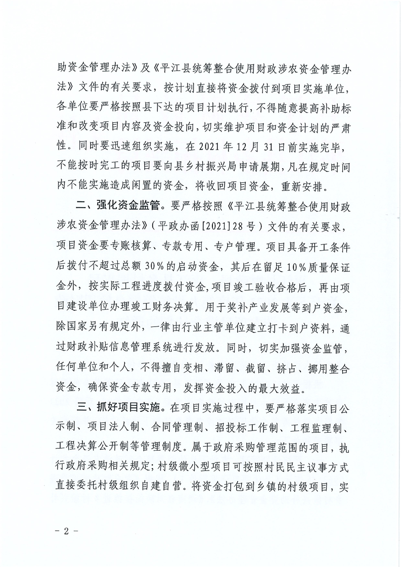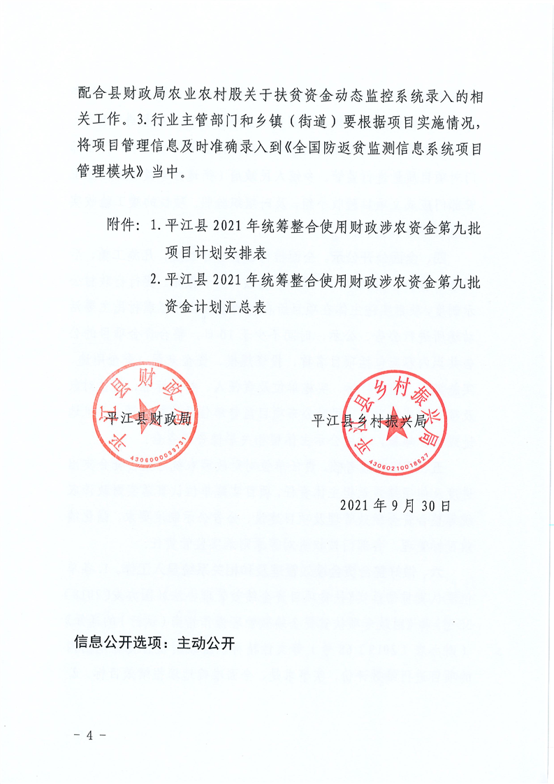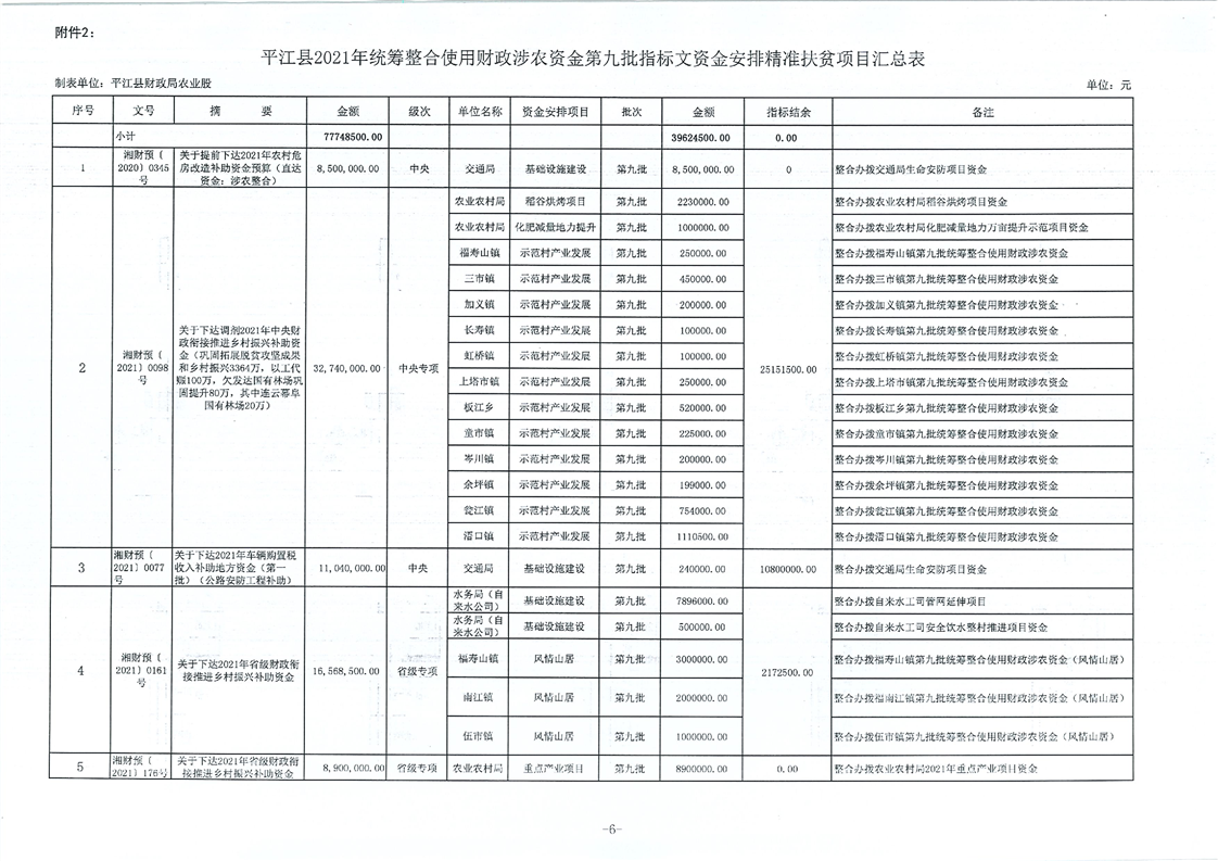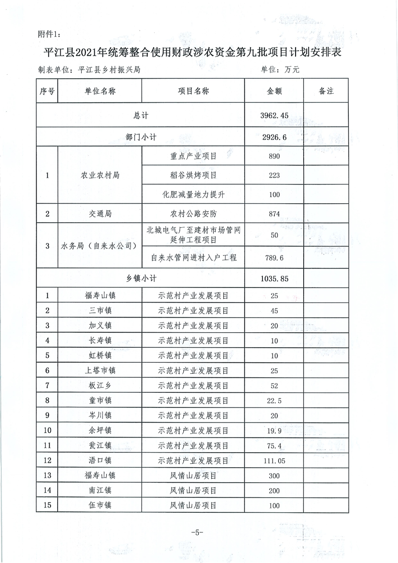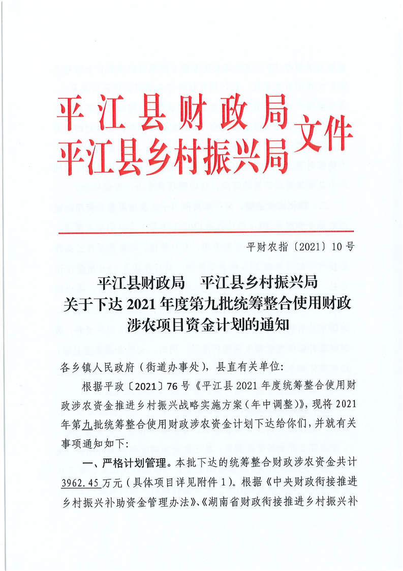 平财农指〔2021〕10号 关于下达2021年度第九统筹整合使用财政涉农项目资金计划的通知