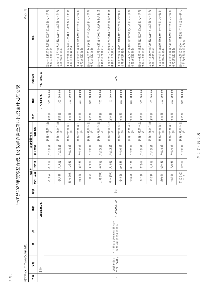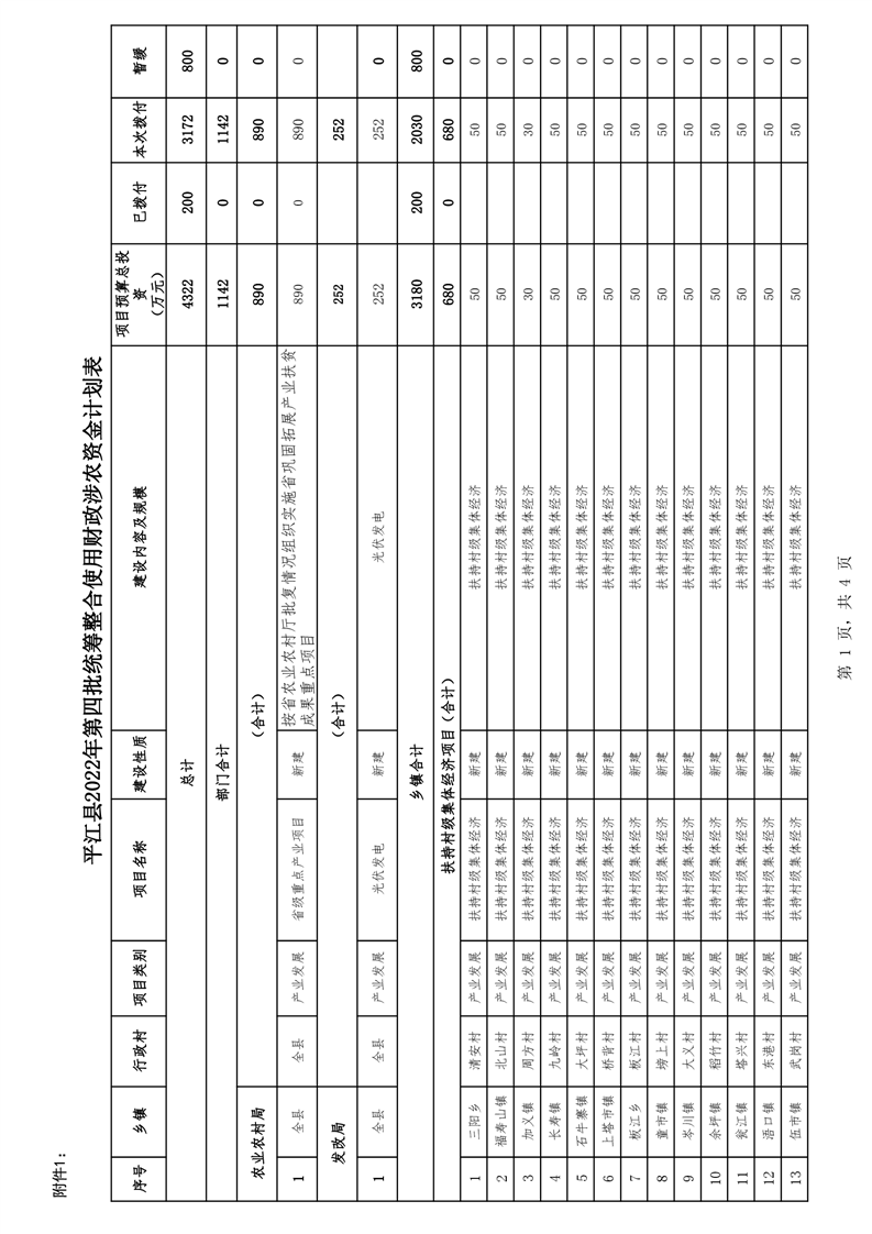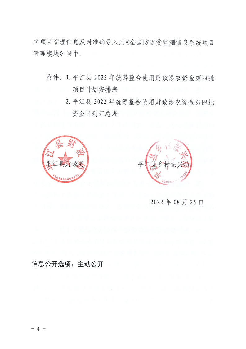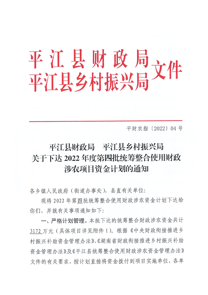 平财农指〔2022〕04号 关于下达2022年度第四统筹整合使用财政涉农项目资金计划的通知