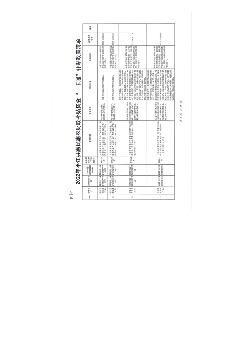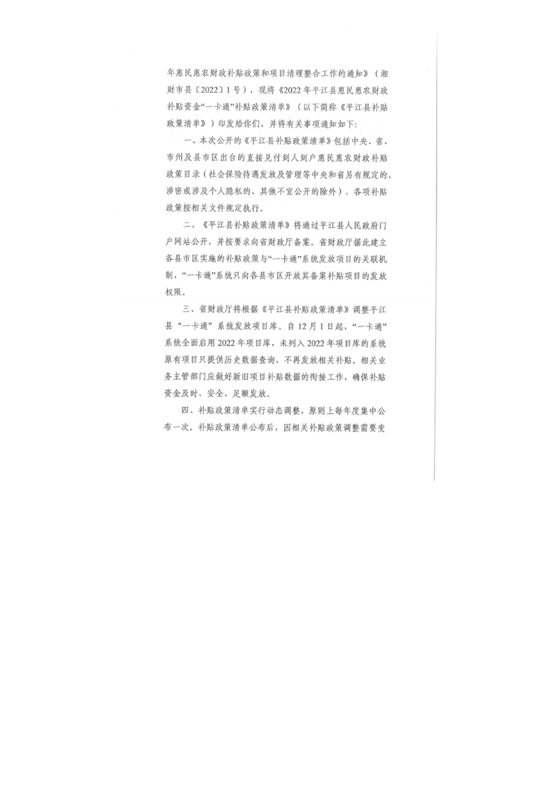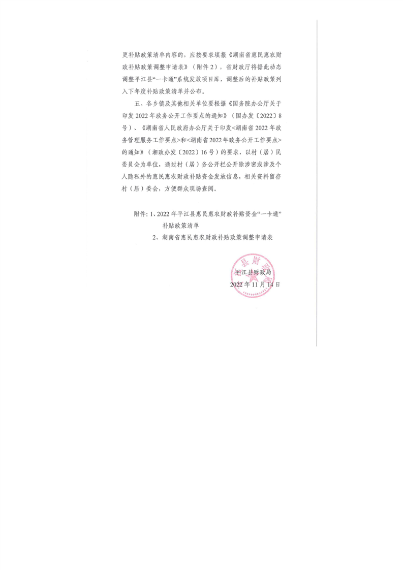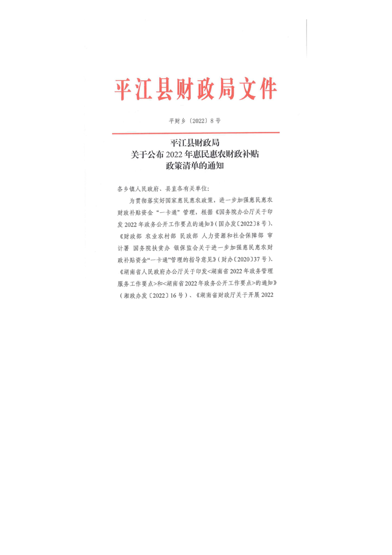 平江县财政局关于公布2022年惠民惠农财政补贴政策清单的通知