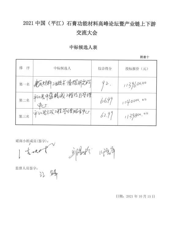 湖南平江常胜建设发展有限公司的2021中国(平江)石膏功能材料高峰论坛暨产业链上下游交流大会采购项目于2021年10月15日结束,现将成交结果公告如下: