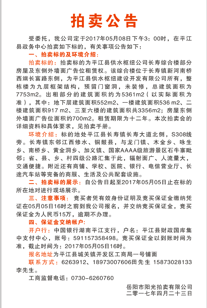 平江县供水枢纽公司长寿综合楼部分房屋及东侧外墙面广告位租赁权拍卖公告