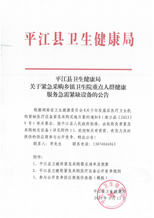 平江县卫生健康局关于紧急采购乡镇卫生院重点人群健康服务急需紧缺设备的公告