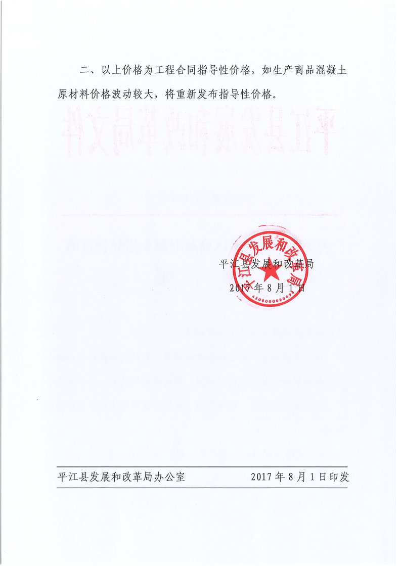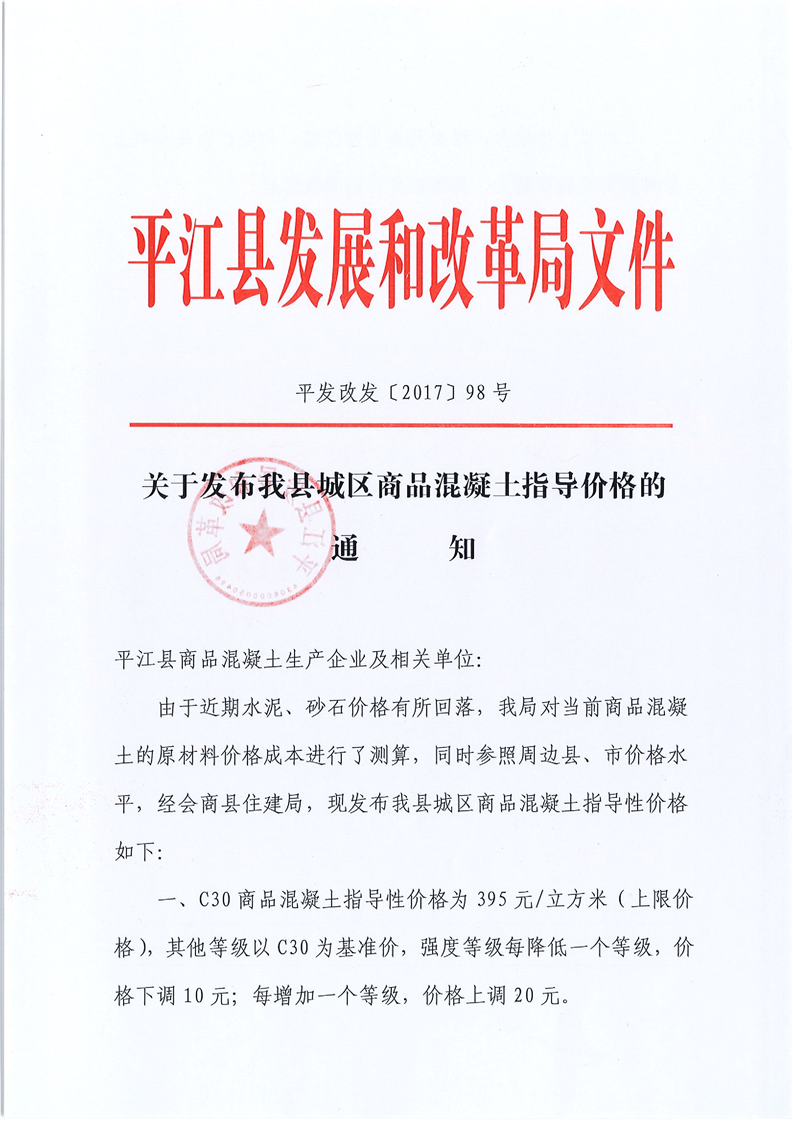 关于发布我县城区商品混凝土指导价格的通知