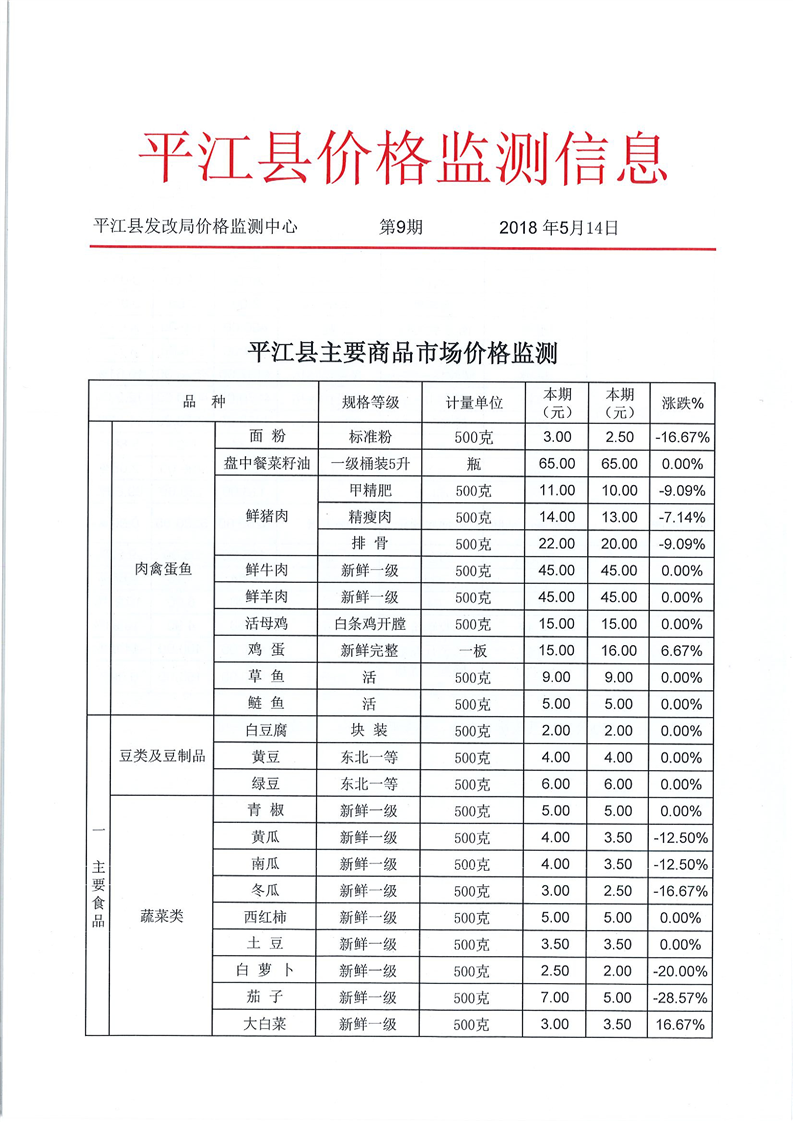平江县价格监测信息2018年第9期