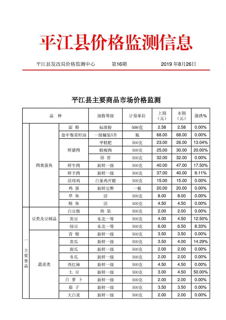 平江县价格监测信息2019年第16期