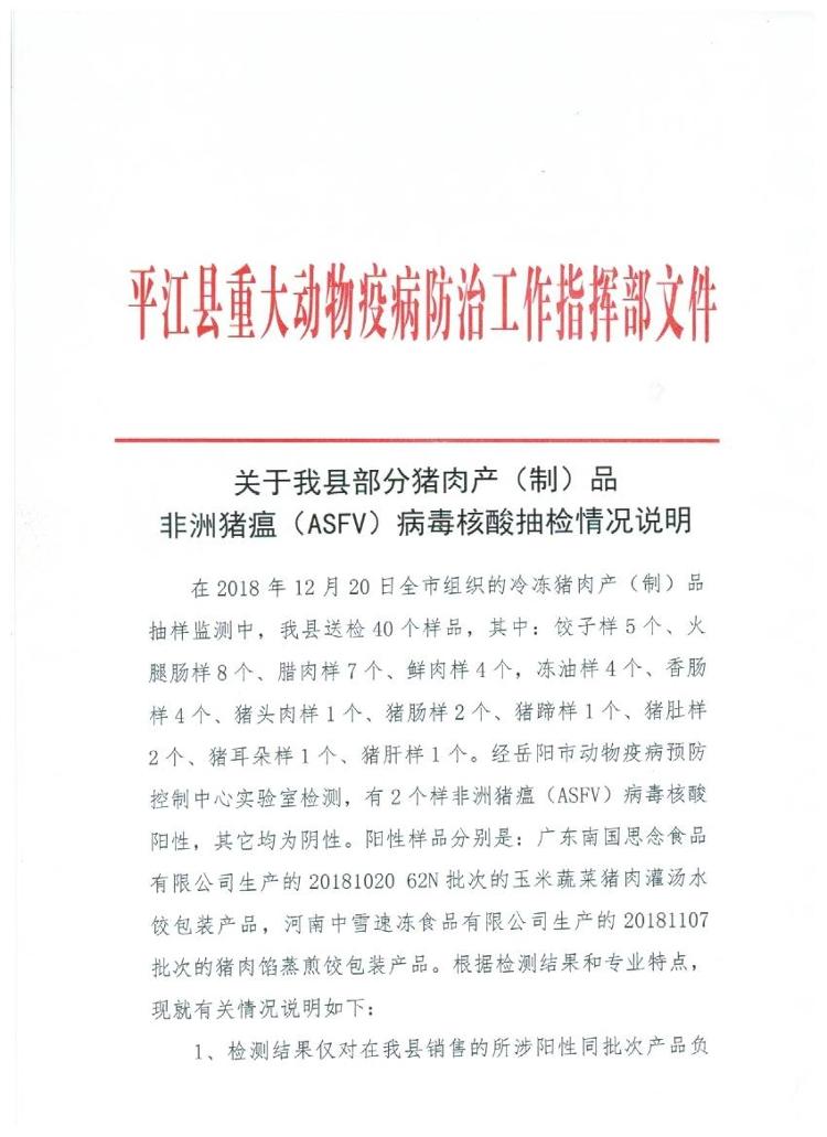 关于我县部分猪肉产(制)品非洲猪瘟(ASFV)病毒核酸抽检情况说明