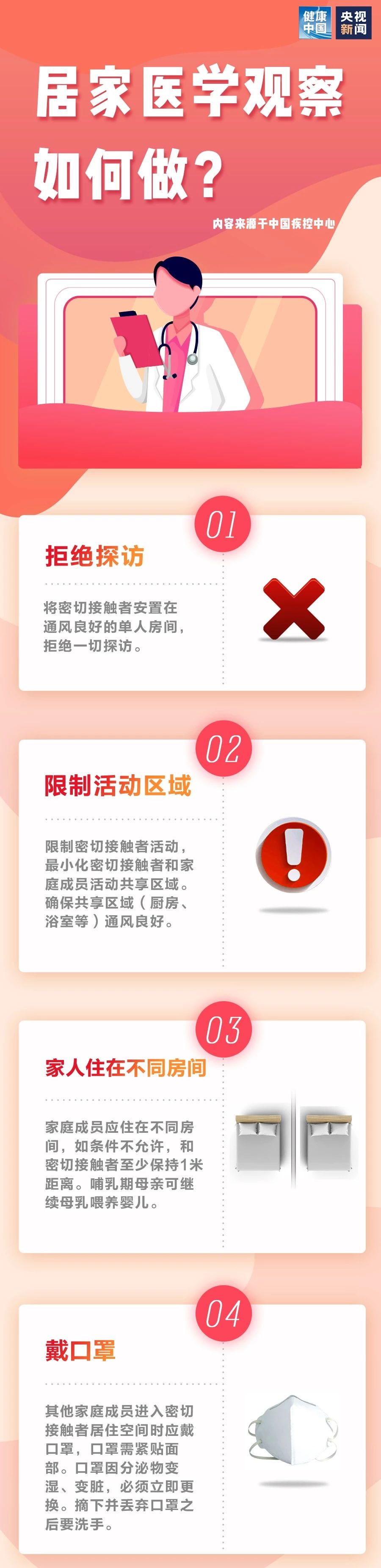 新型冠状病毒感染的肺炎确诊病例的密切接触者,应从和病人接触的最后一天起采取医学观察14天。在家中观察期间,需与医学观察人员保持联系,并需要了解病情观察和护理要点,掌握家庭预防的洗手、通风、防护和消毒措施。