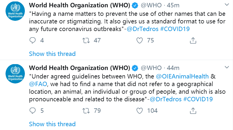 世卫组织同时在官方推特上解释了命名准则:“根据世界卫生组织(WHO)与世界动物卫生组织(OIE)、联合国粮食及农业组织(FAO)商定的准则,我们必须找到一个命名,不涉及地理位置、动物、个人或人群,而且这个命名也要易读,并与该疾病有关。”