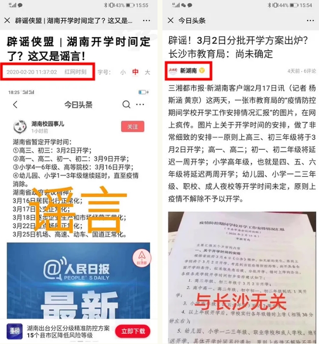 近日,省内多个微信圈中转发一张今日头条“湖南校园事儿”的博文截图,文中“湖南省学校将于3月2日起分批开学”等内容,经有关部门核实系谣言(2月20日有关部门已发布辟谣声明)。