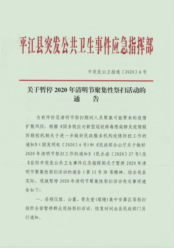 为有序防范清明节祭扫期间人员聚集可能带来的疫情扩散风险,根据《国务院应对新型冠状病毒感染肺炎疫情联防联控机制关于进一步做好民政服务机构疫情防控工作的通知》(国发明电〔2020〕6号)和《民政部办公厅关于做好2020年清明节祭扫工作的通知》(民办函〔2020〕27号)及《岳阳市突发公共卫生事件应急指挥部关于暂停2020年清明节聚集性祭扫活动的通告(第11号)》等精神,结合我县实际,现就暂停2020年清明节聚集性祭扫活动有关事项通告如下: