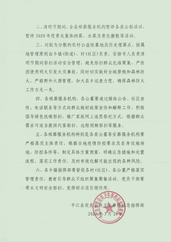 二、清明节期间,全县殡葬服务机构暂停各类公祭活动,暂停2020年度骨灰集体树葬、水葬及骨灰撒散等活动。