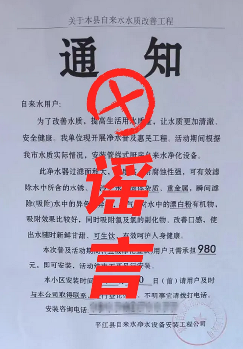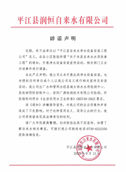 刚刚,记者从县润恒自来水有限公司获悉,有不法人员以“平江县自来水净水设备安装工程公司”名义,在各小区张贴所谓“关于本县自来水水质改善工程”的通知,开展净水设备安装宣传活动。经查实,此通知为不实信息,该公司辟谣声明如下: