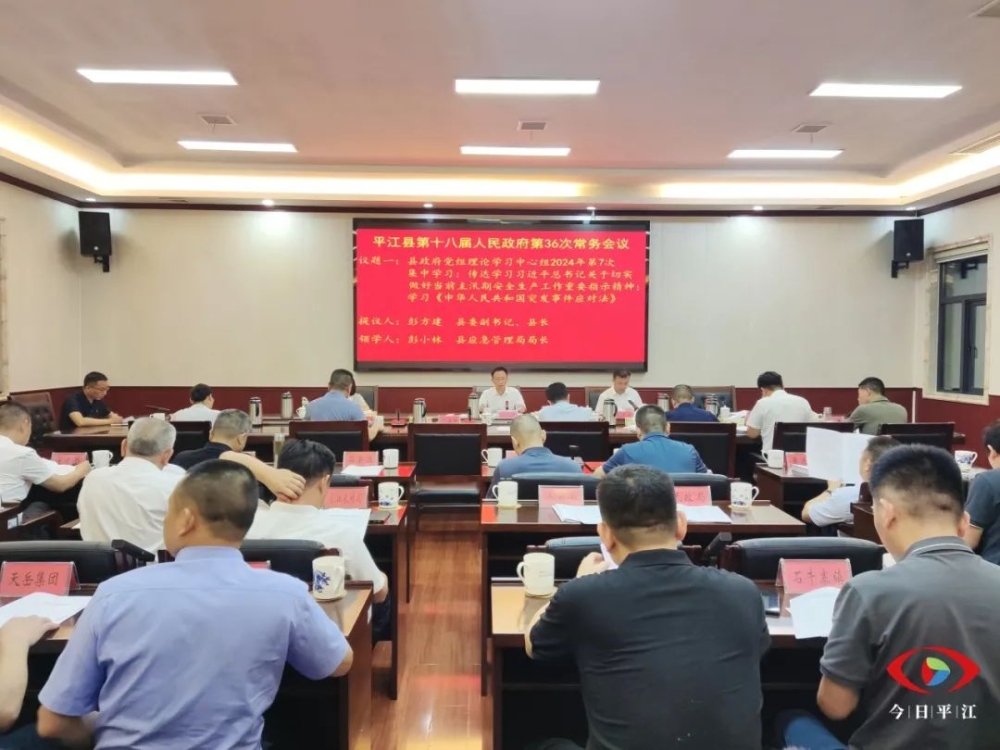 7月30日晚,县委副书记、县长彭方建主持召开平江县第十八届人民政府第36次常务会议,传达学习习近平总书记关于切实做好当前主汛期安全生产工作重要指示精神,听取关于华电湖南分公司和我县合作事项框架协议的情况汇报,研究城镇基准地价更新工作,审议相关规范性文件和方案。